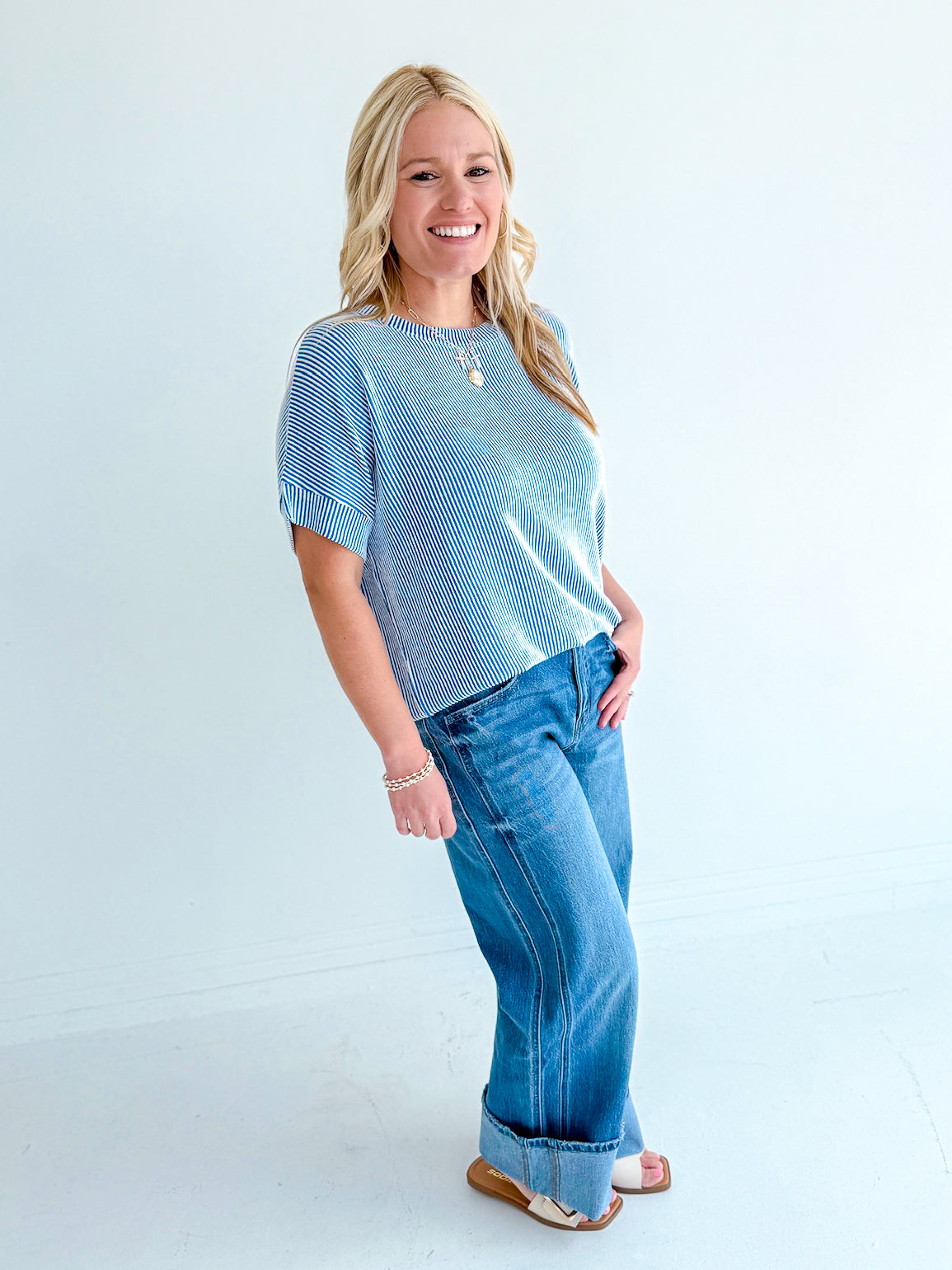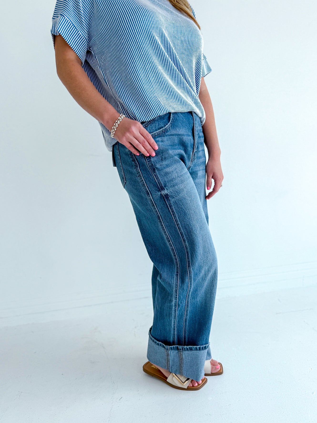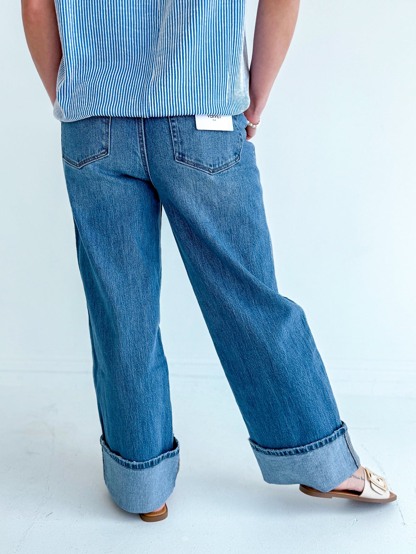 A dark wash super high rise denim with a baggy fit and wide cut. Finished hem and cuffed.