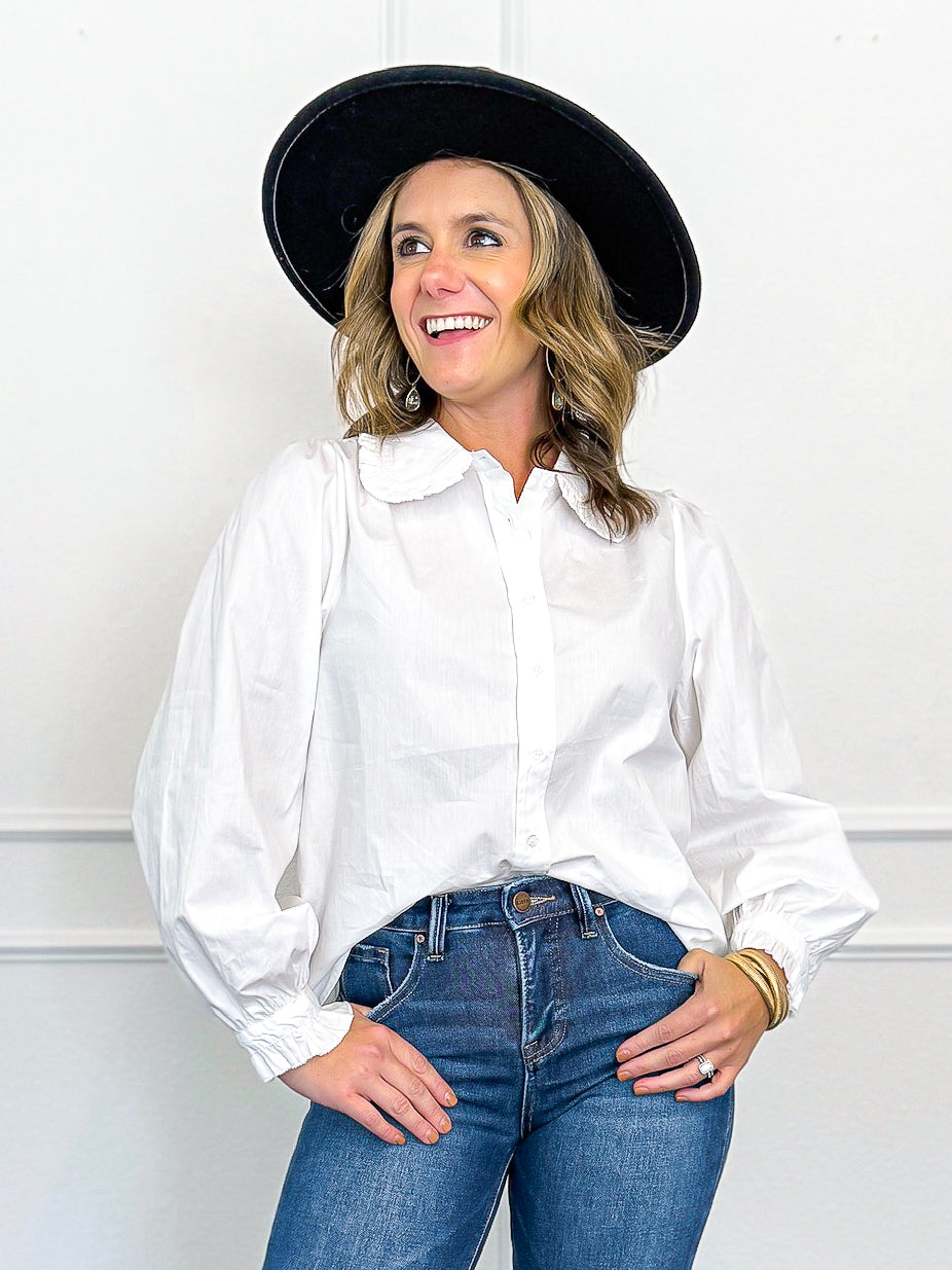 A long sleeved blouse with button up and statement collar. Model is shown in size small.