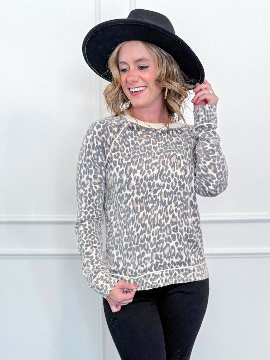 A leopard print inside out pullover with raglan sleeve and crewneck. Model is shown in size small.