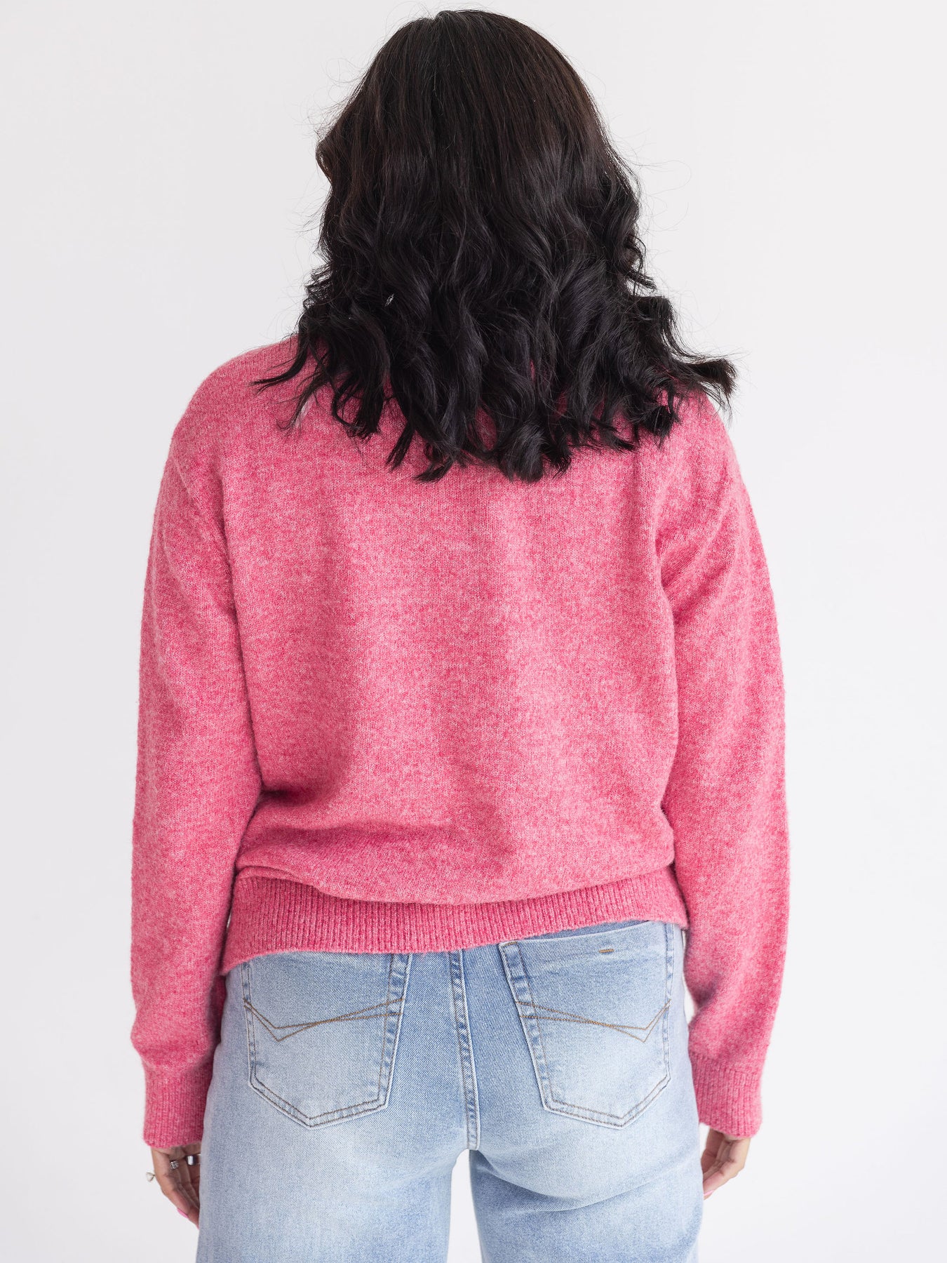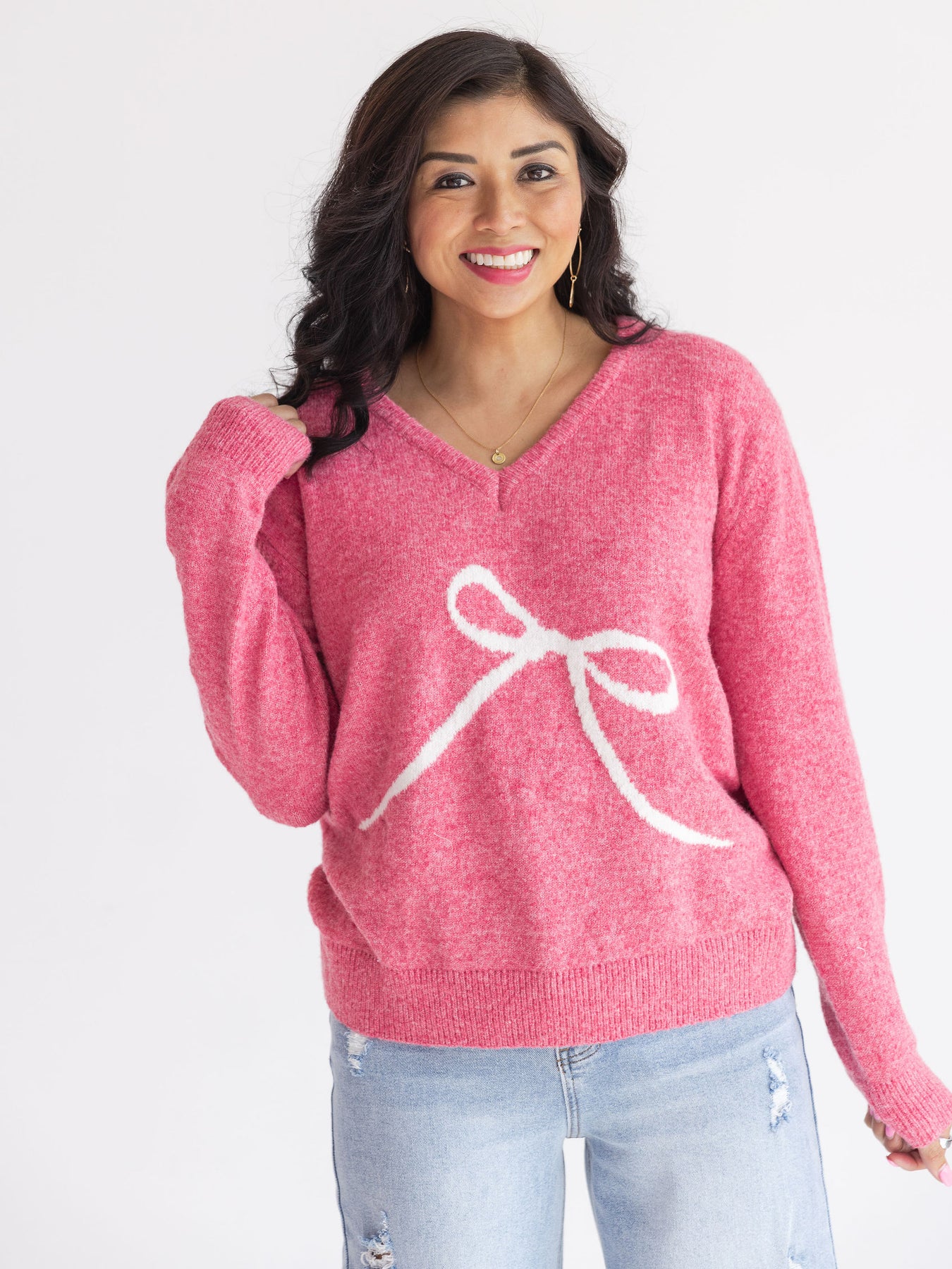 A lovely pink v neck sweater with bow ribbon design. Model is shown in size small.