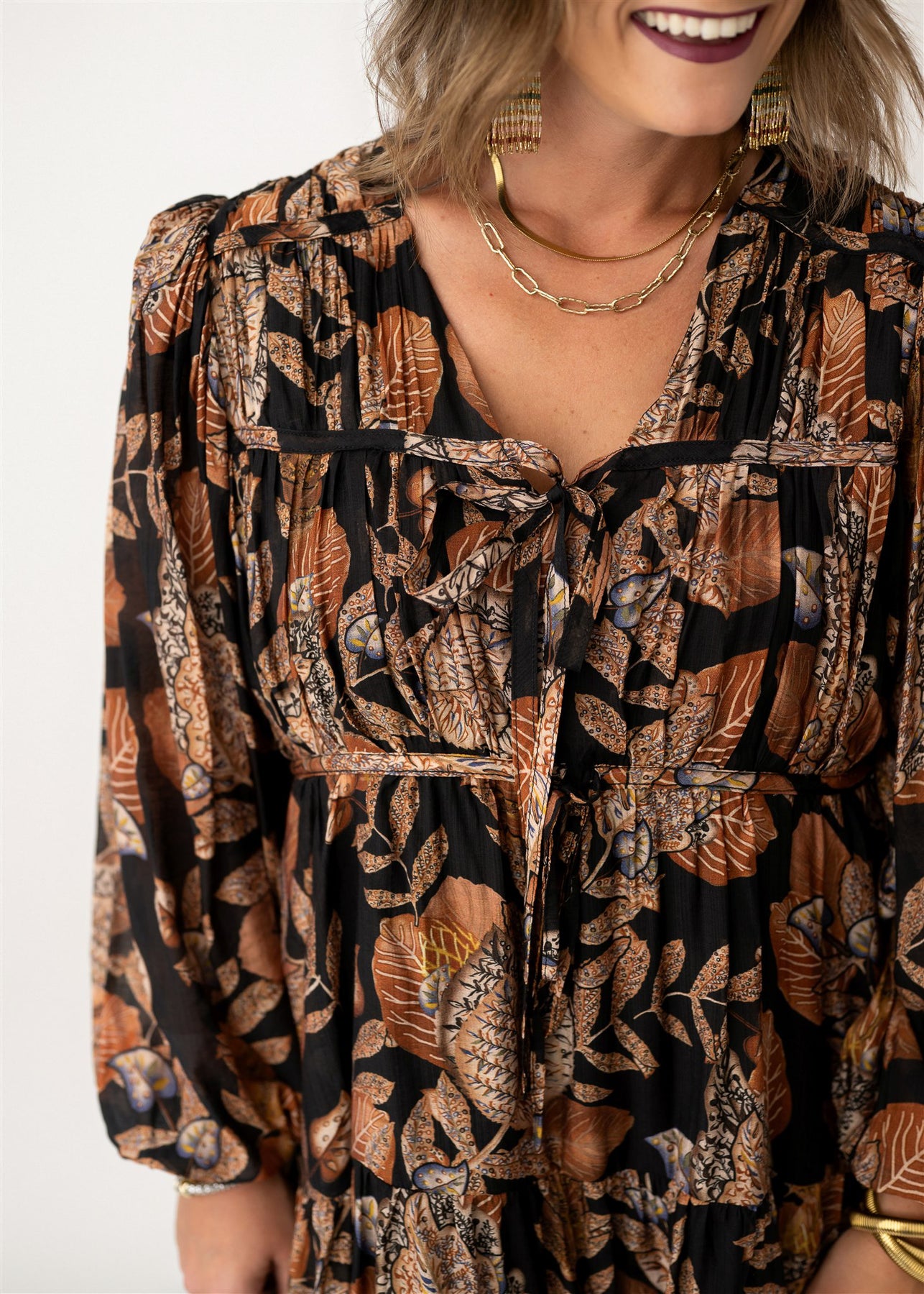A long sleeve dress with beautiful fall leaf fabric. Tie details and elastic at wrists. Model is shown in size small.