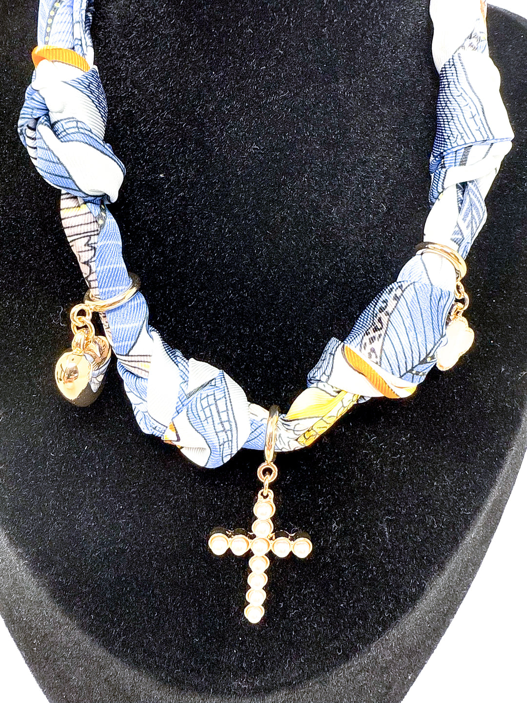 A blue knotted scarf necklace with 3 charms: cross, design, puffy heart.