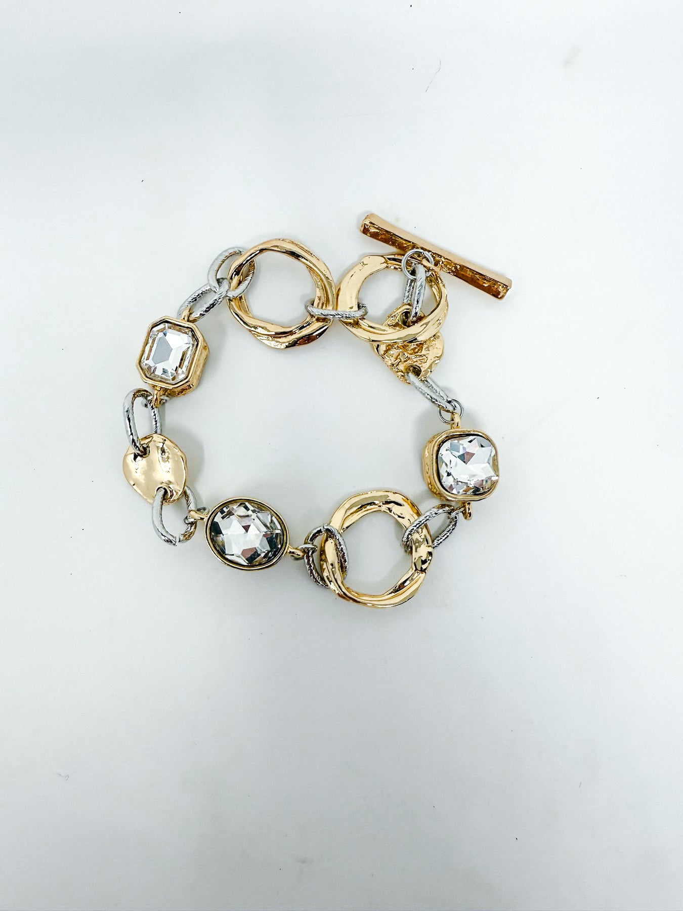 A chunky gold bracelet with rhinestones and toggle clasp.
