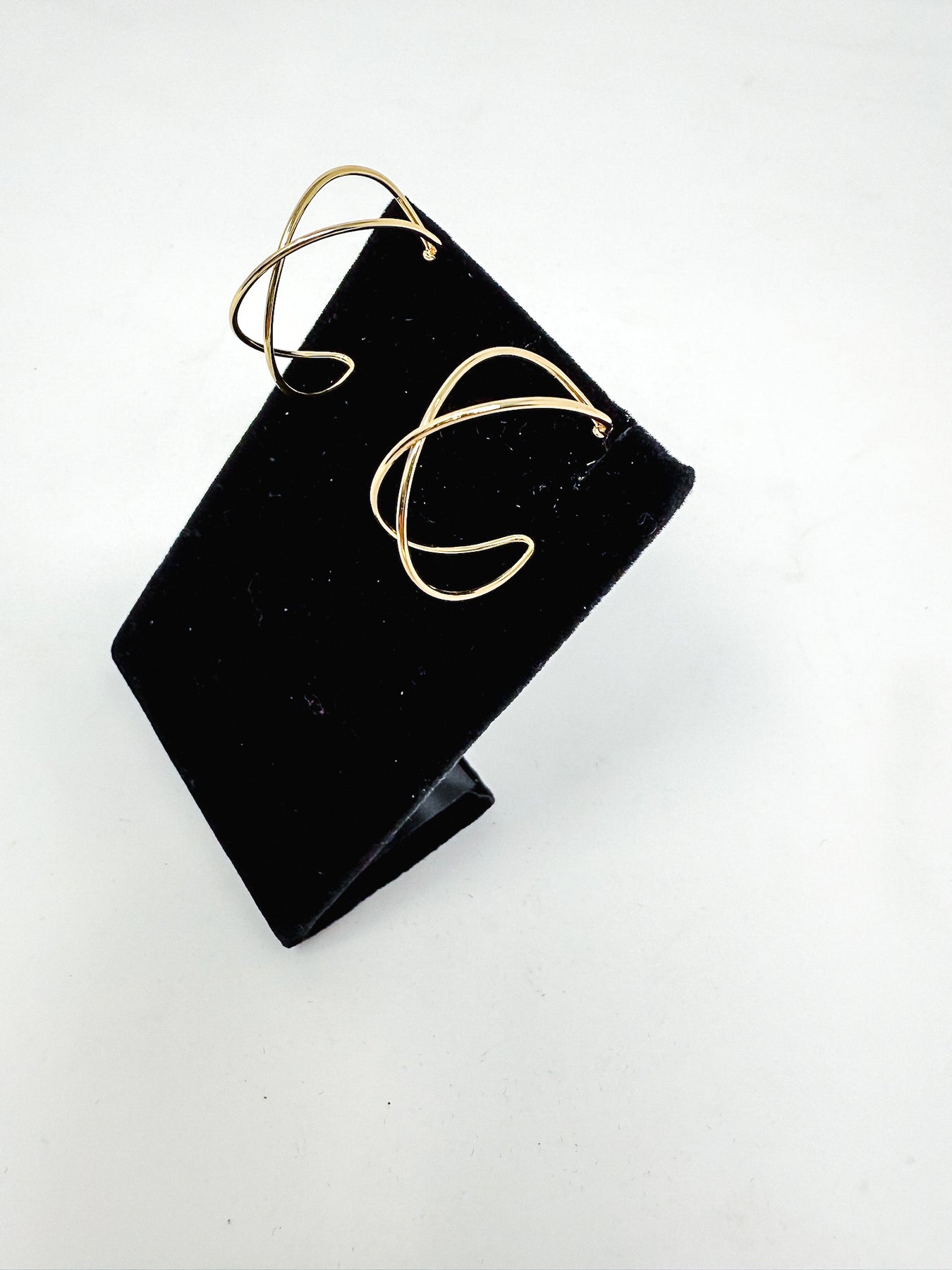 A pair of thin gold double hoops with criss cross design.