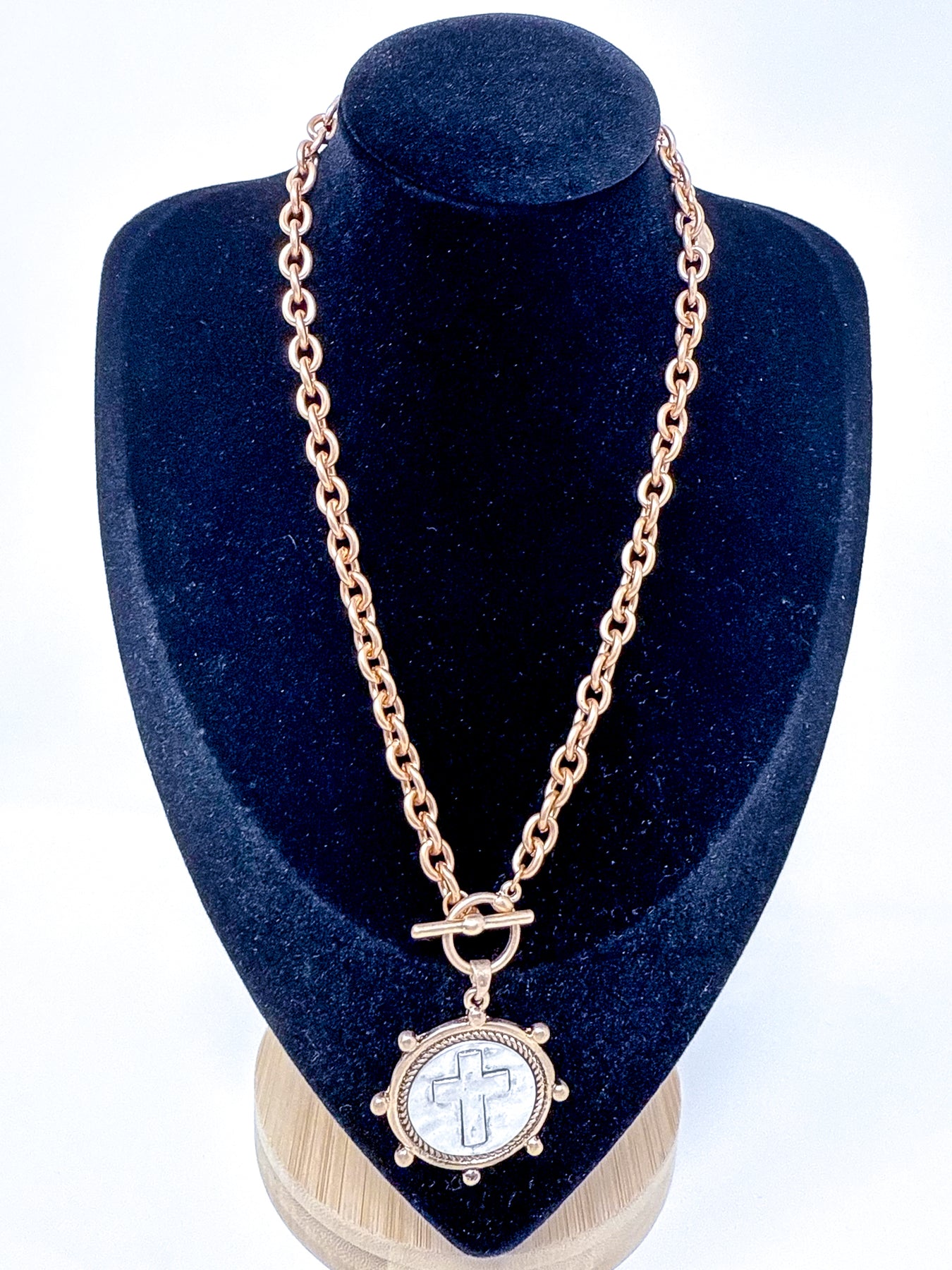 A gold necklace with chunky chain, toggle front closure, and cross coin pendant.