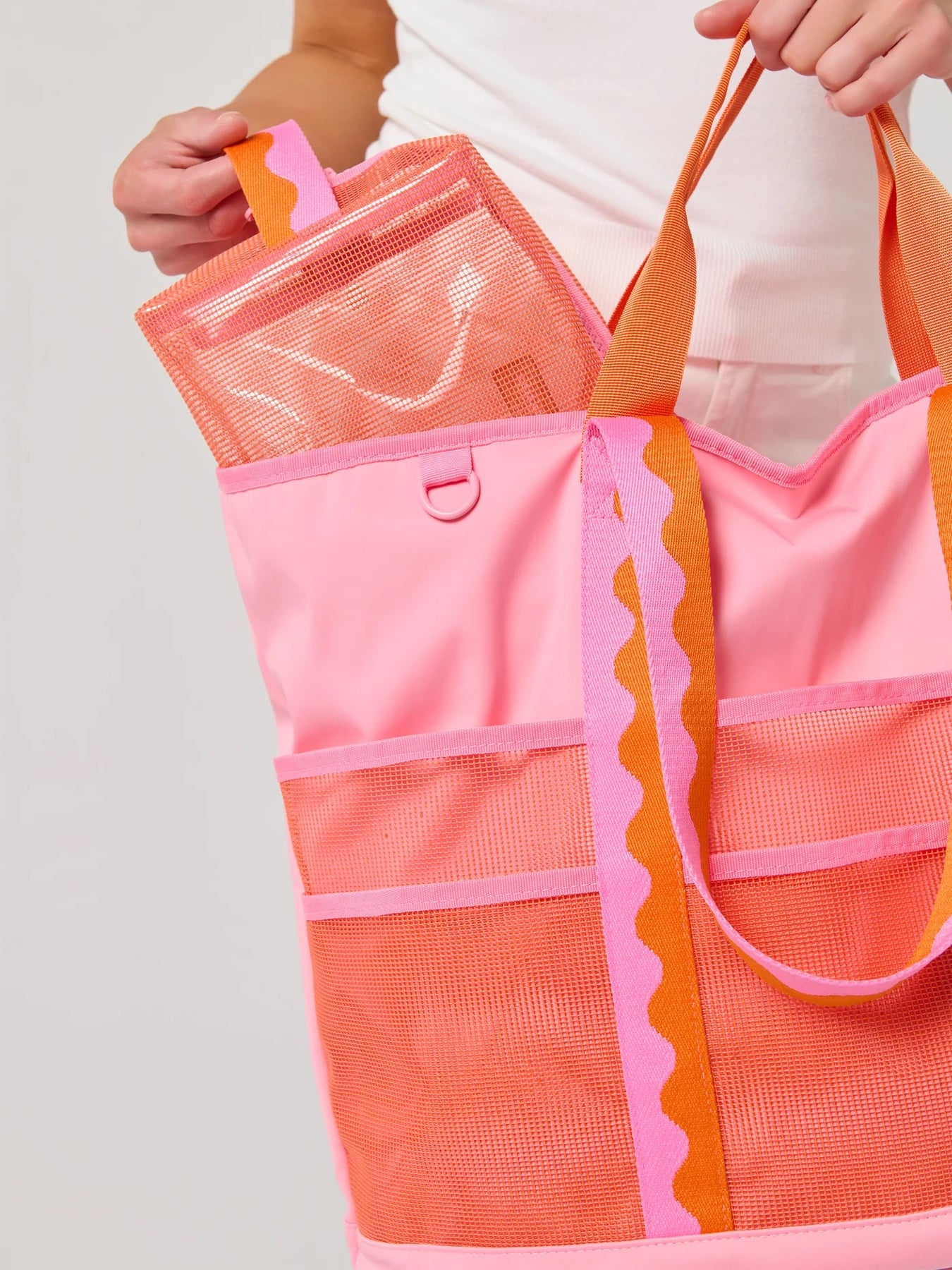 Meet the Camden Neoprene Tote – your ultimate carry-all companion for sunny days and seaside escapes. Featuring double handles and shoulder straps, a secure top zip closure, and a roomy interior with two slip pockets and one zip pocket, it keeps everything in place. Six outer slip pockets add even more organization, perfect for stashing sunscreen, shades, and snacks. Designed in vibrant color combos with playful wavy trim, this tote brings bold, beach-ready style wherever you go.