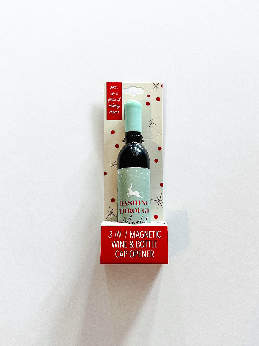 An adorable wine bottle magnet that functions as both a wine and bottle opener. Box reads, "Pour up a glass of holiday cheer"