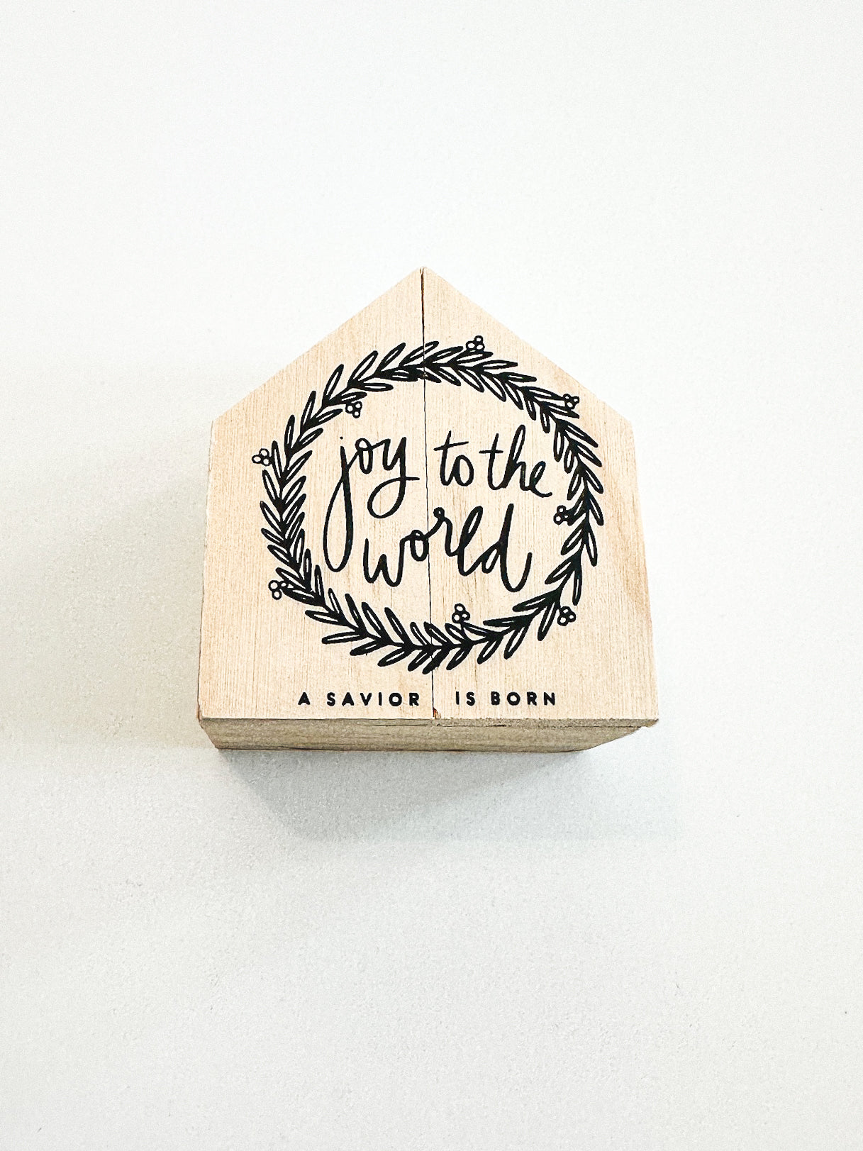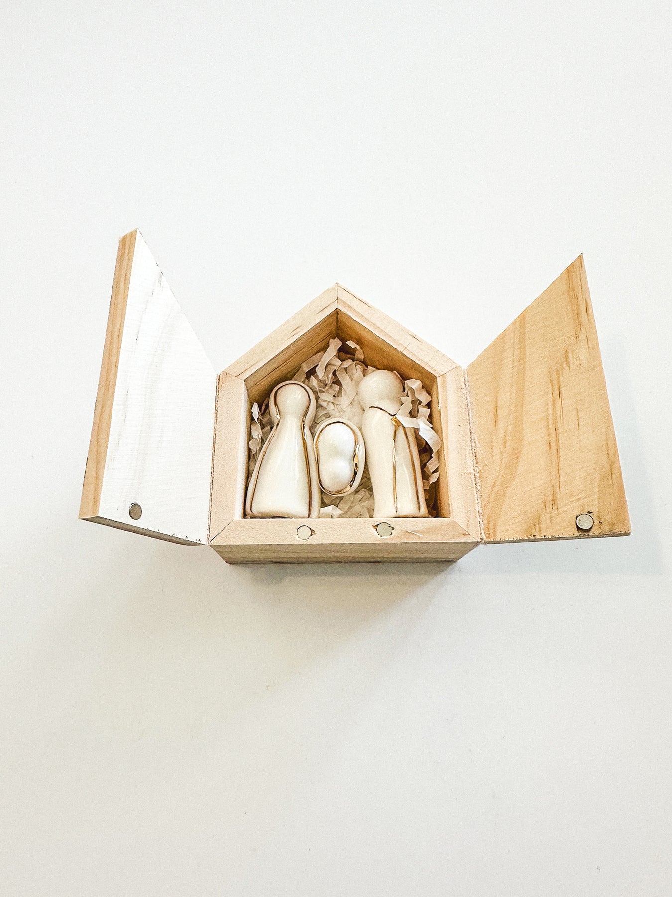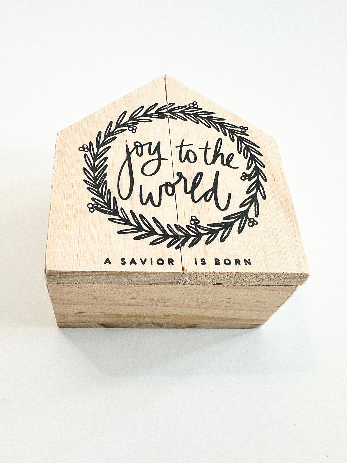 A wooden gift box that reads, "joy to the world, a savior is born." Three ceramic figurines inside.