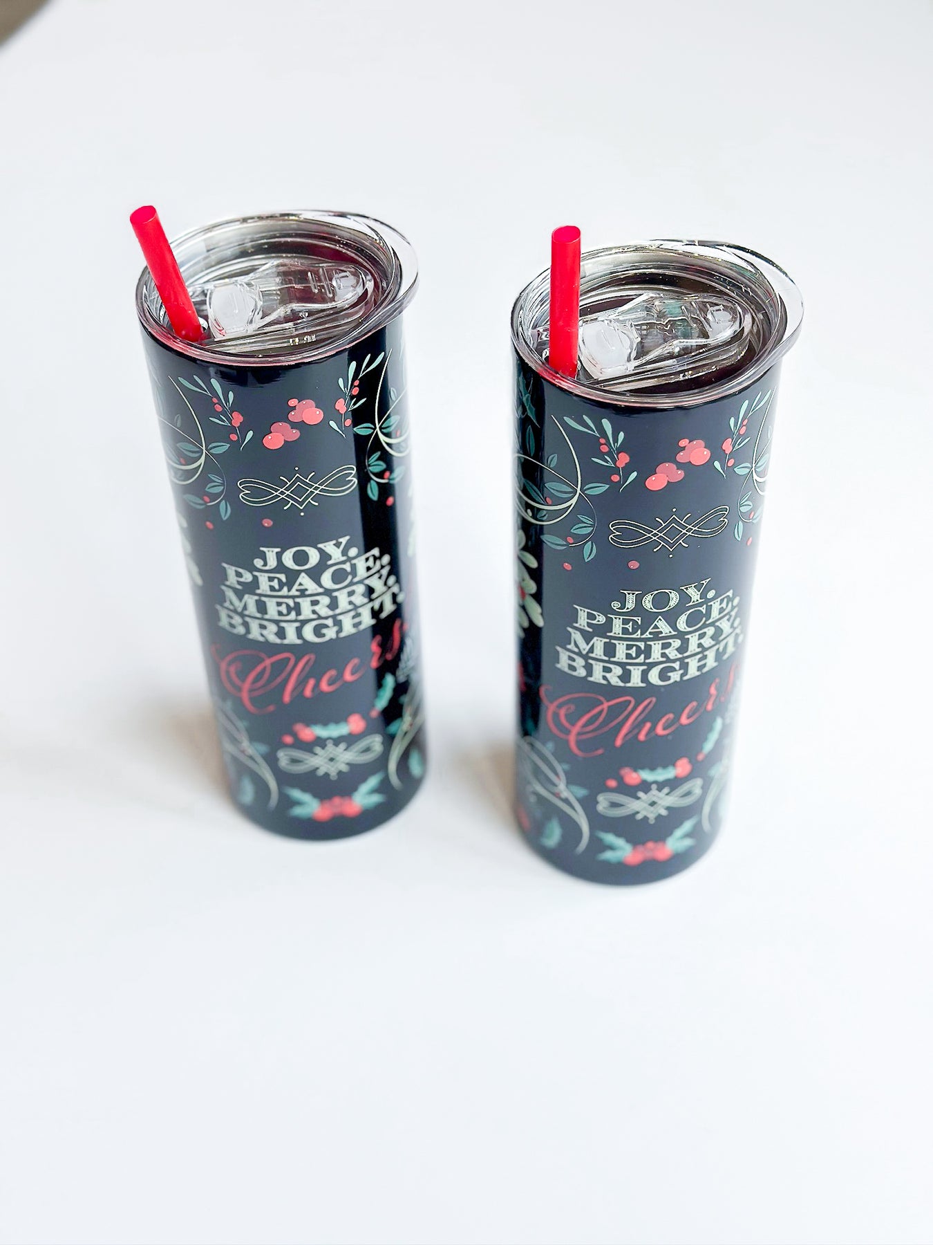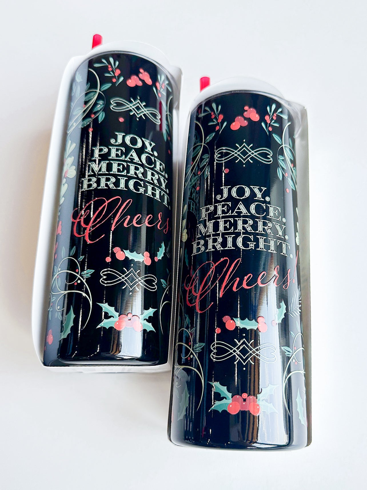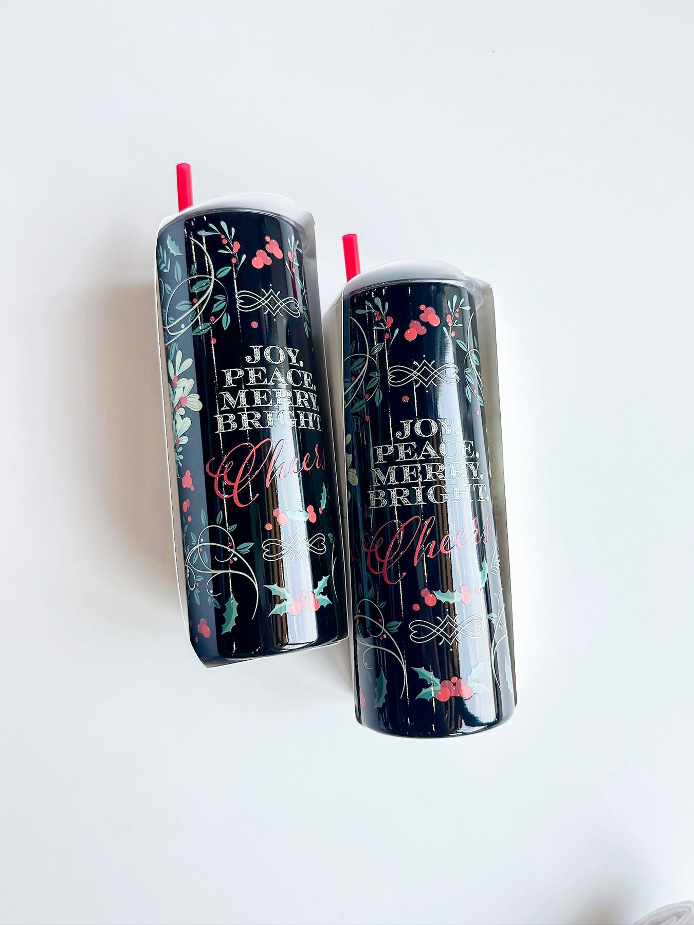 A 20 oz tumbler with lid and red straw. Reads, "Joy, Peace Merry, Bright, Cheers."