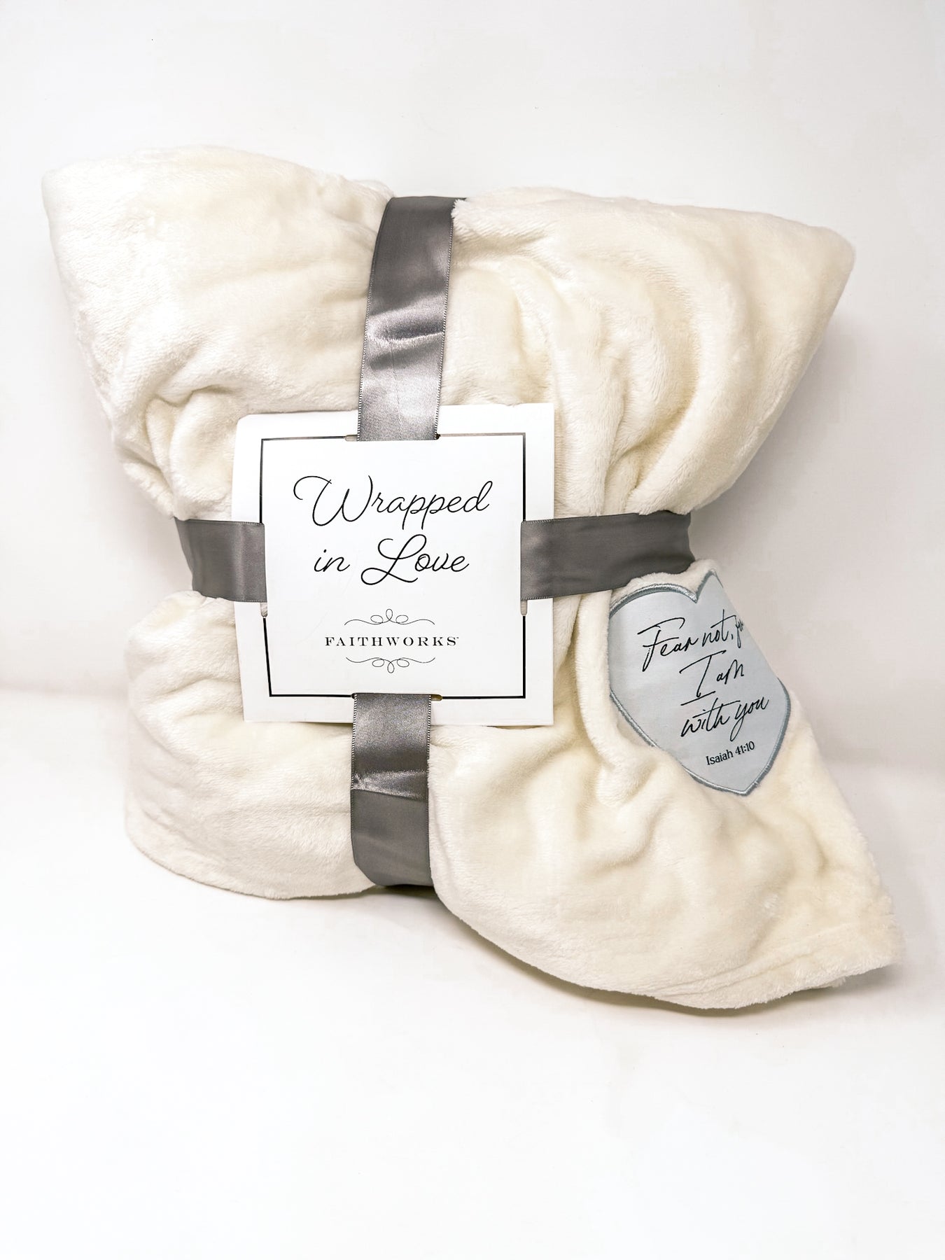 A lovely neutral blanket with embroidered heart patch that reads, "Fear not, for I am with you. Isaiah 41:30."