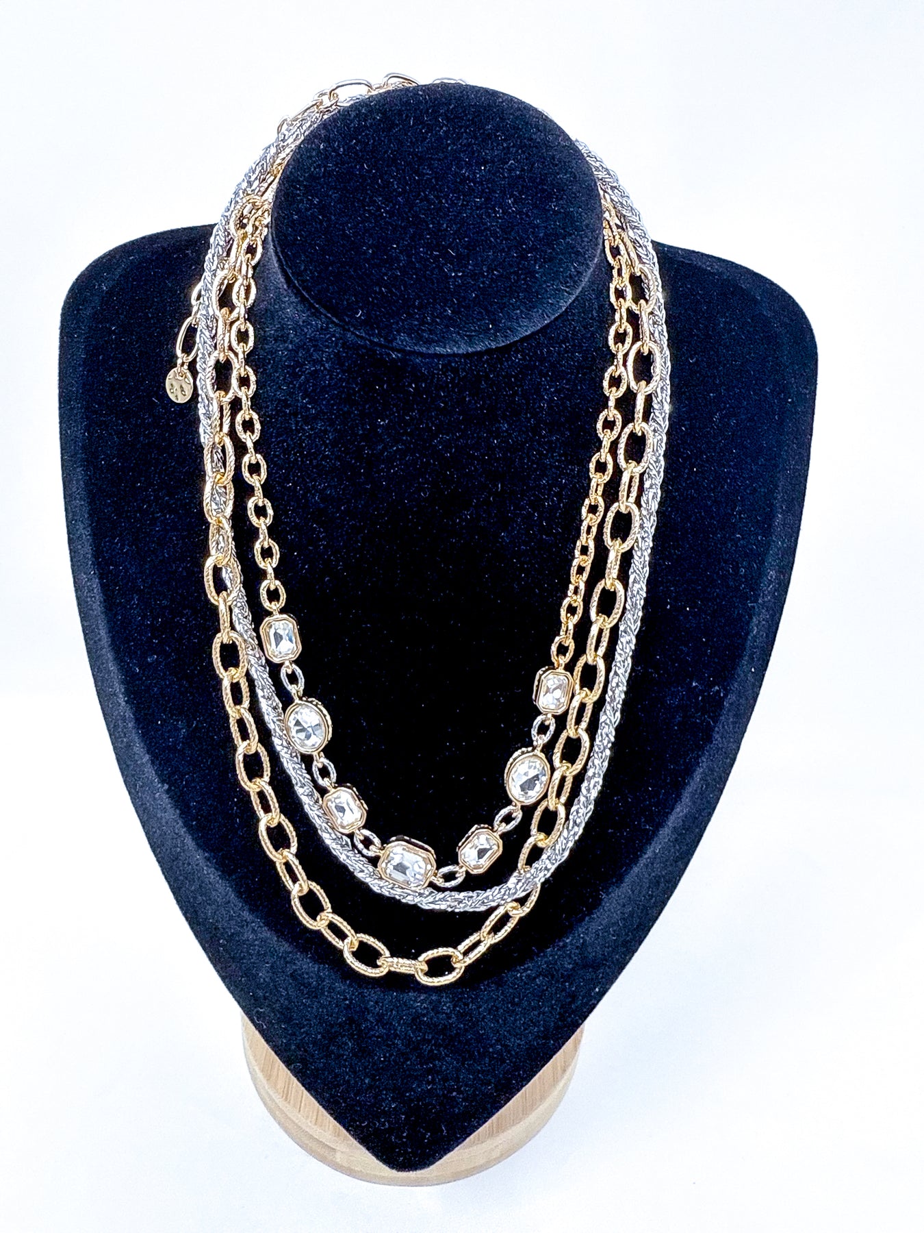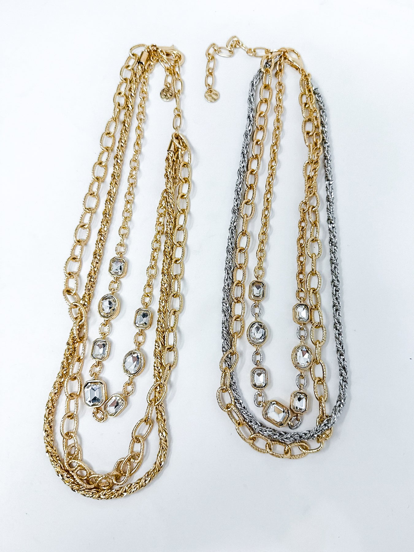A layered necklace with three chains. Single clasp. Clear Crystals.