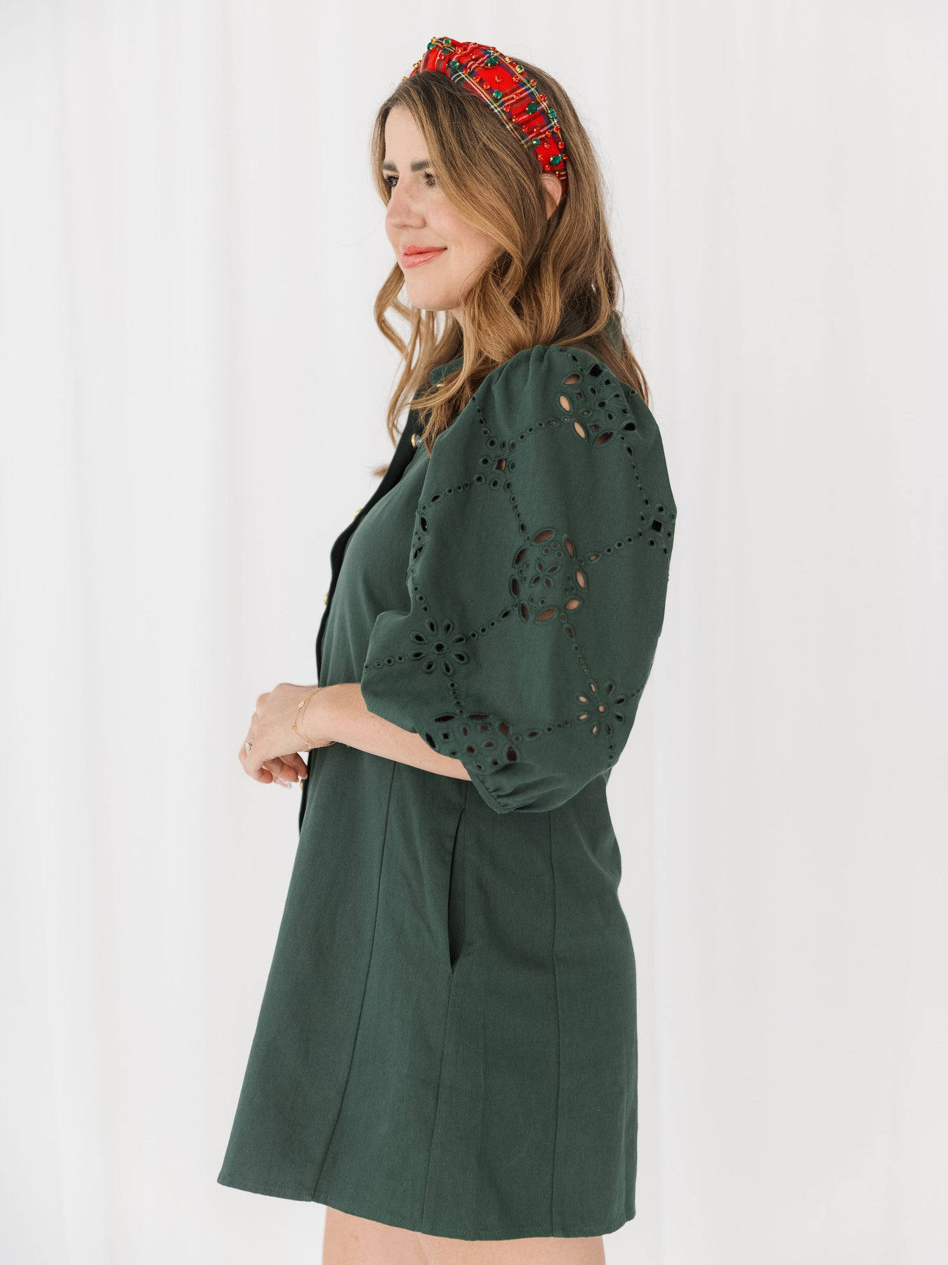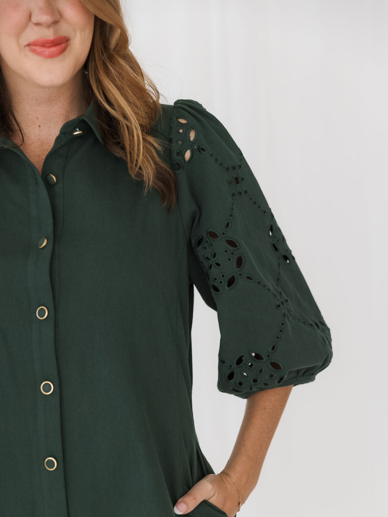 A collared dress with full button front, 3/4 detailed sleeves, and short length. Model is shown in size small.