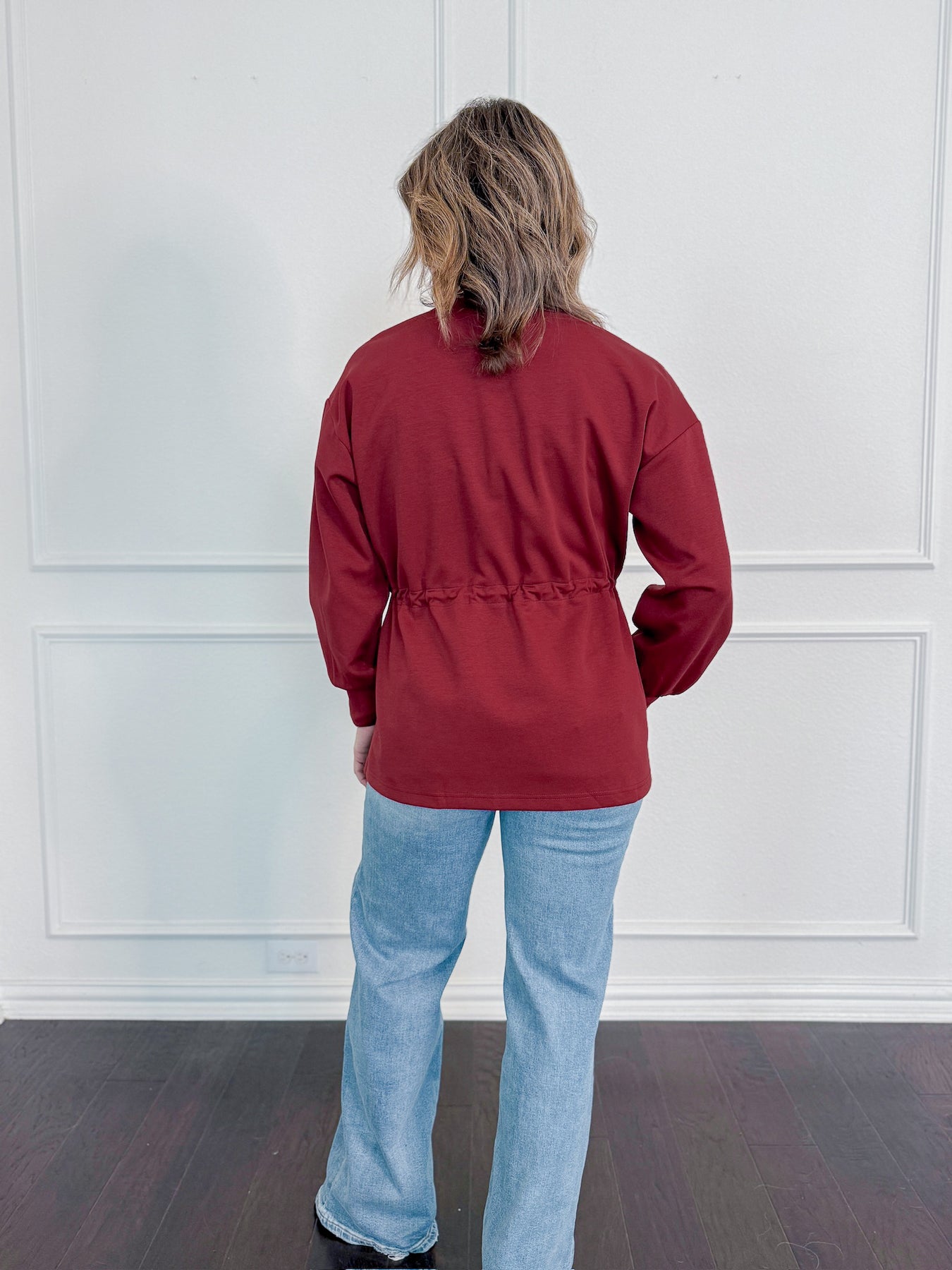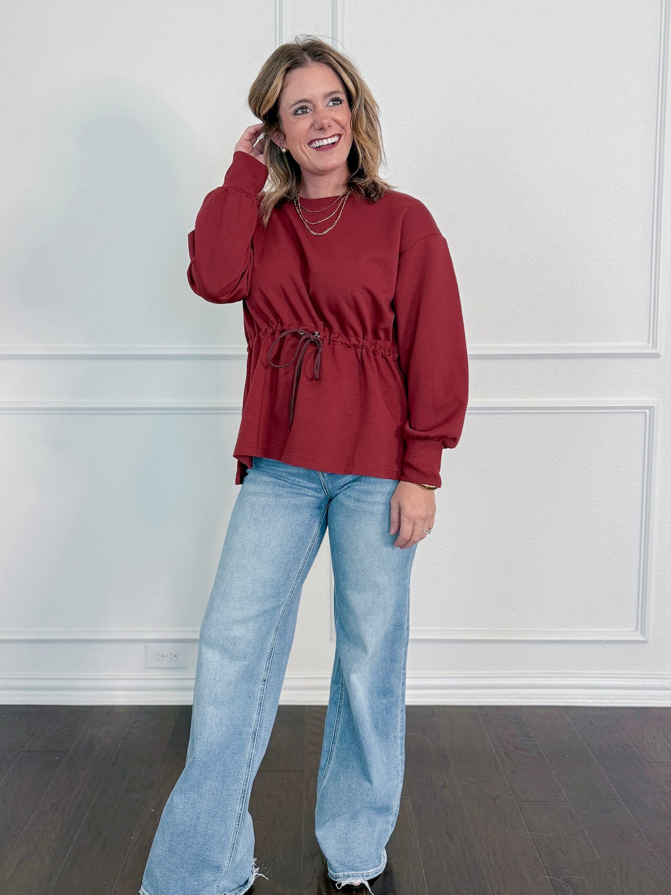 A crewneck pullover with long sleeves and cinch-able waist! Model is shown in size small.