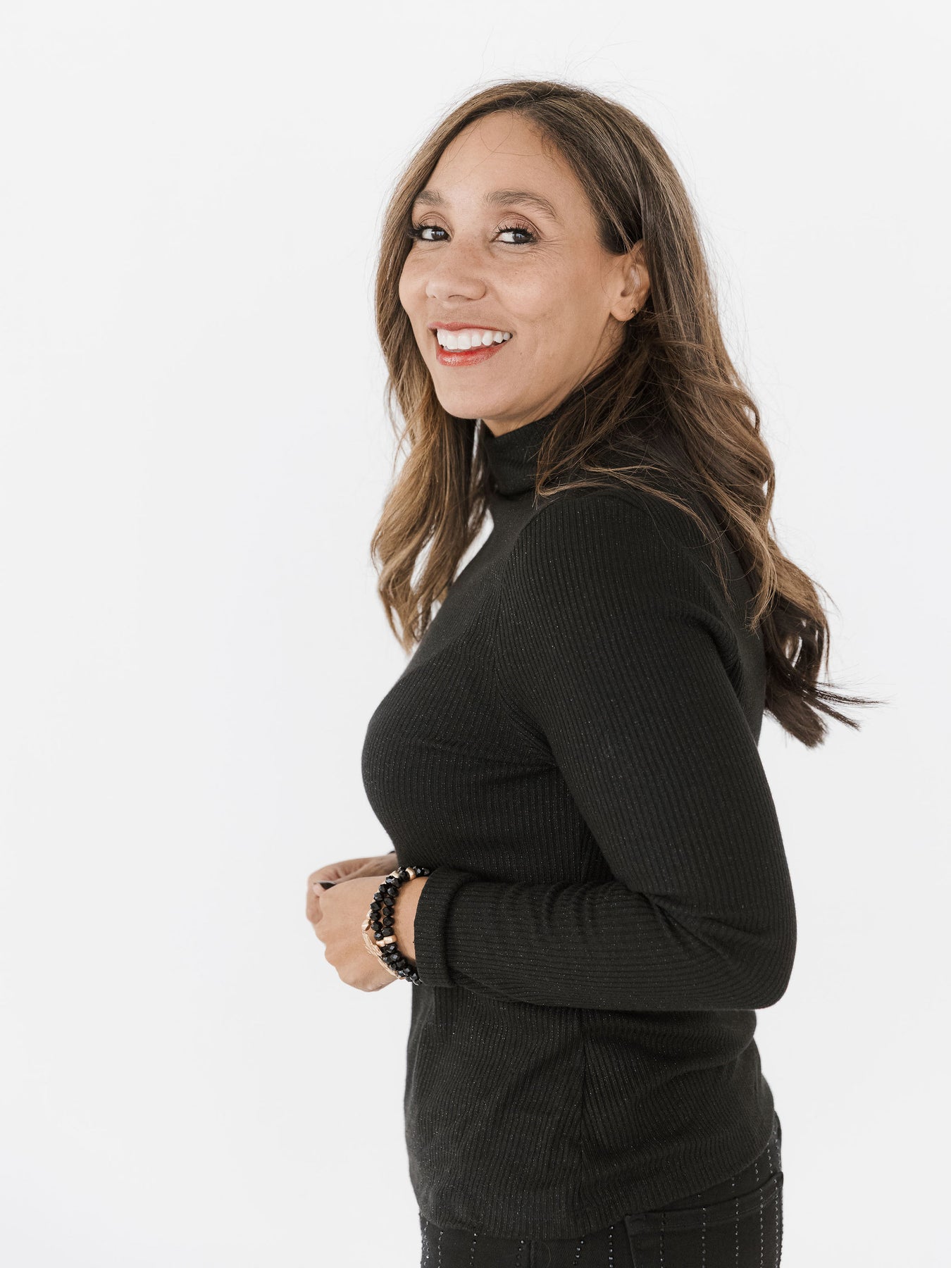 A stretchy black shimmer long sleeved top with mock neckline. Model is shown in size small.