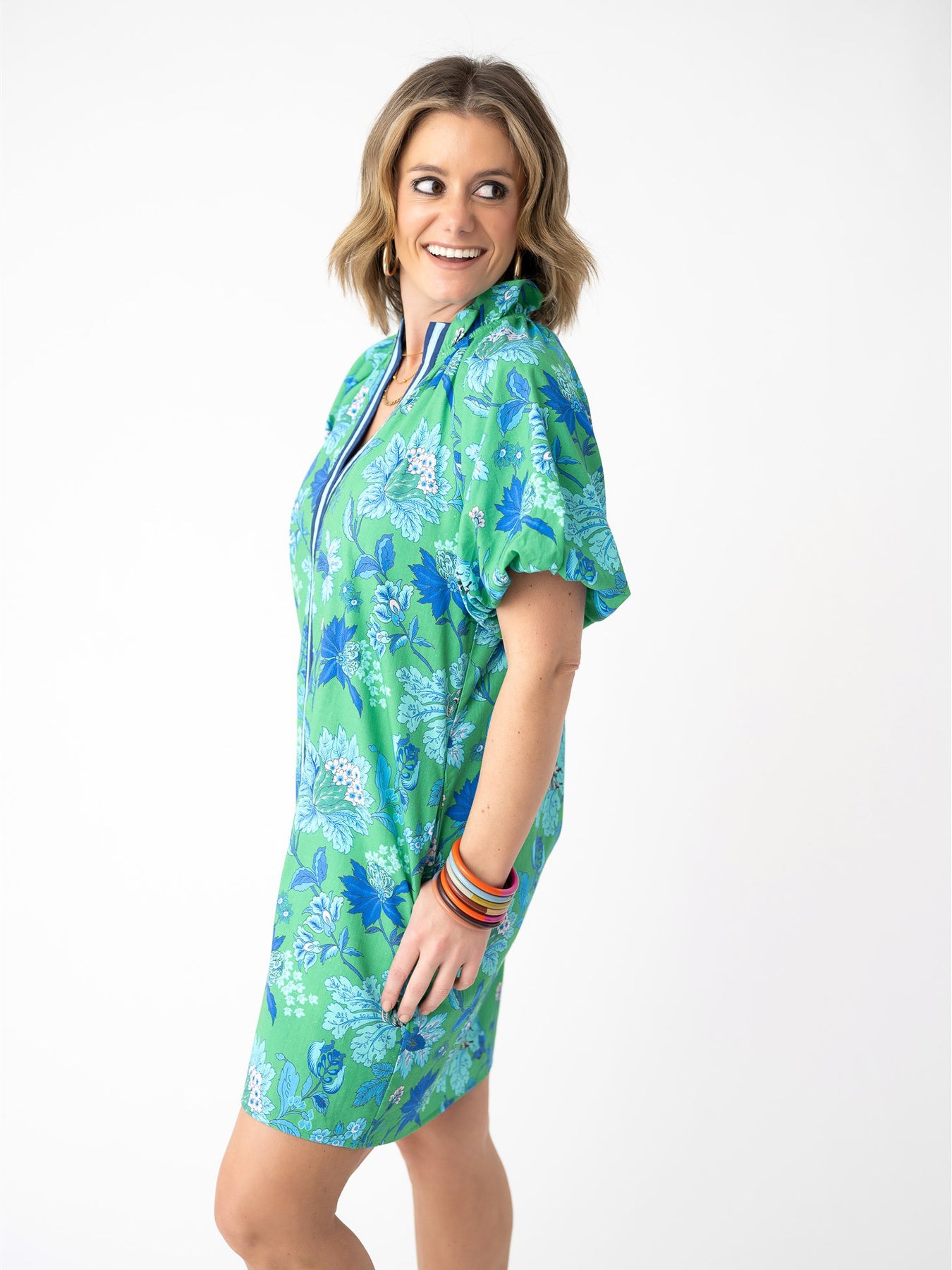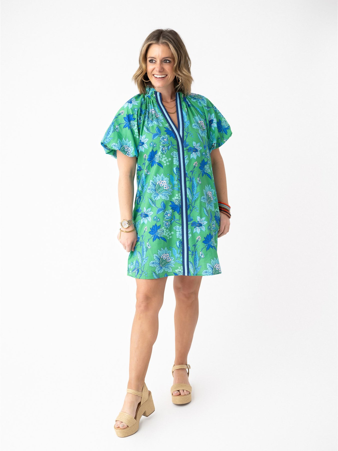 A midi with maximum details! Ruffled neckline, contrast detail at surplice v down to hem, puff short sleeves, and a beautiful fabric.