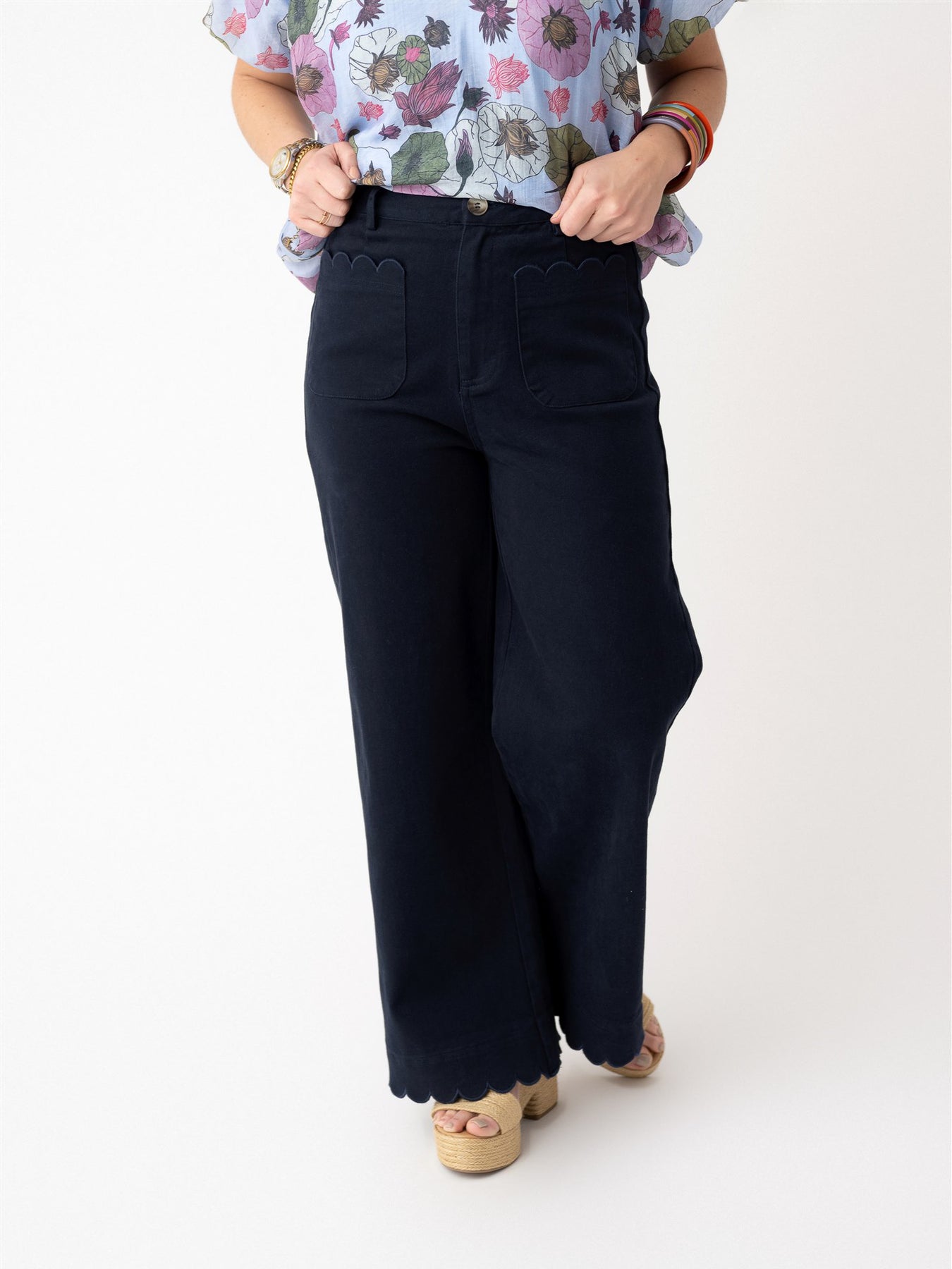 A button up pant with functional belt loops, wide leg, and an adorably perfect petal hem at front pockets & ankles!