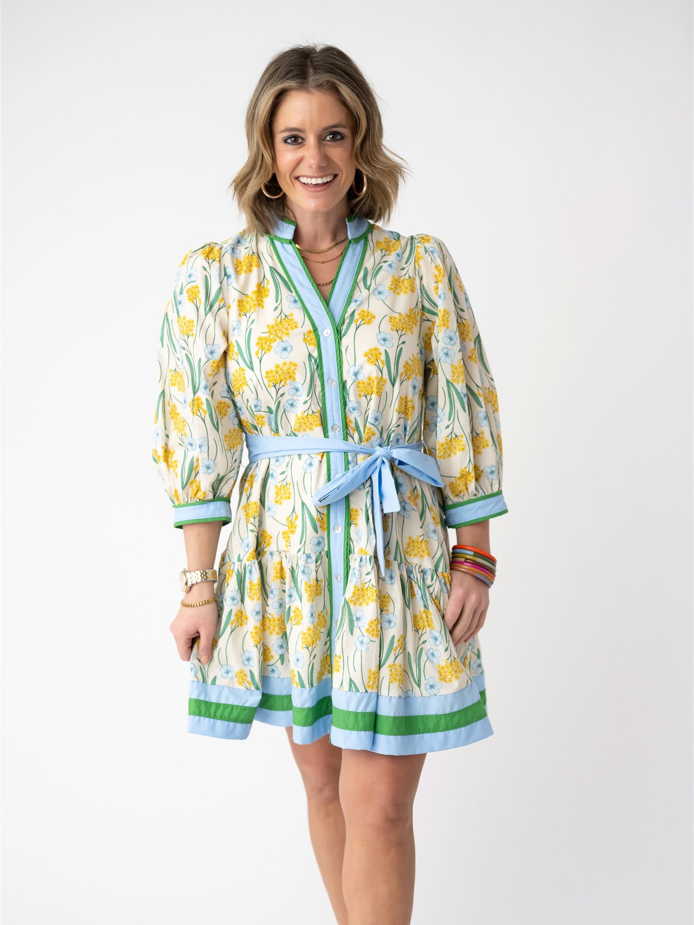 This gorgeous style from Entro will have you looking for a party to attend! Full button front, v neckline with high neck, functional tie waist, and contrast stripes at neckline, wrists and waist. Fabric is an off white base with yellow & blue floral details.