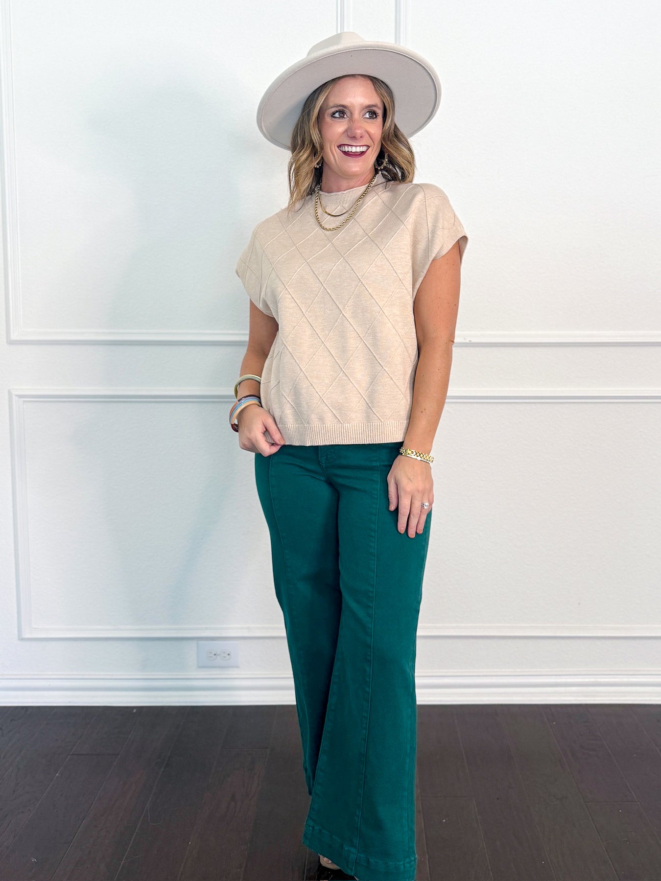 A drop shoulder mock neck sweater. Geo texture, cropped length. Model is shown in size small.