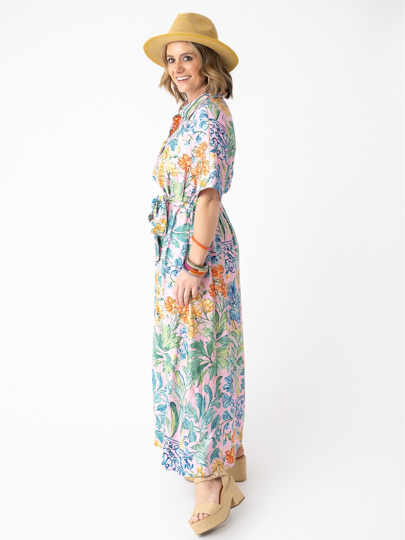 A long shirt dress with collared neckline, full button front, tie waist and short sleeves ... and the most perfect "island vibes" fabric!