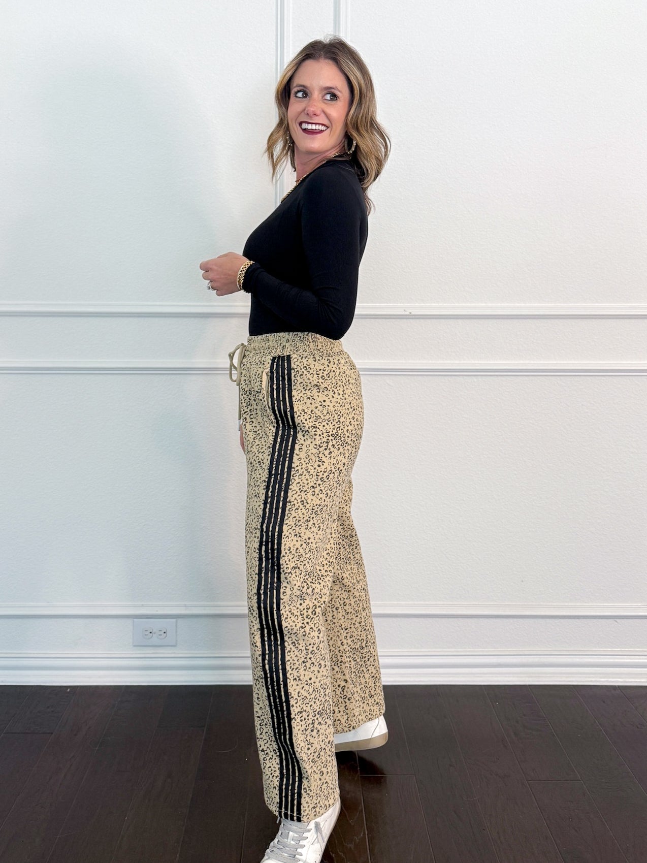 A drawstring leopard pant with black side stripe detail. Model is shown in size small.