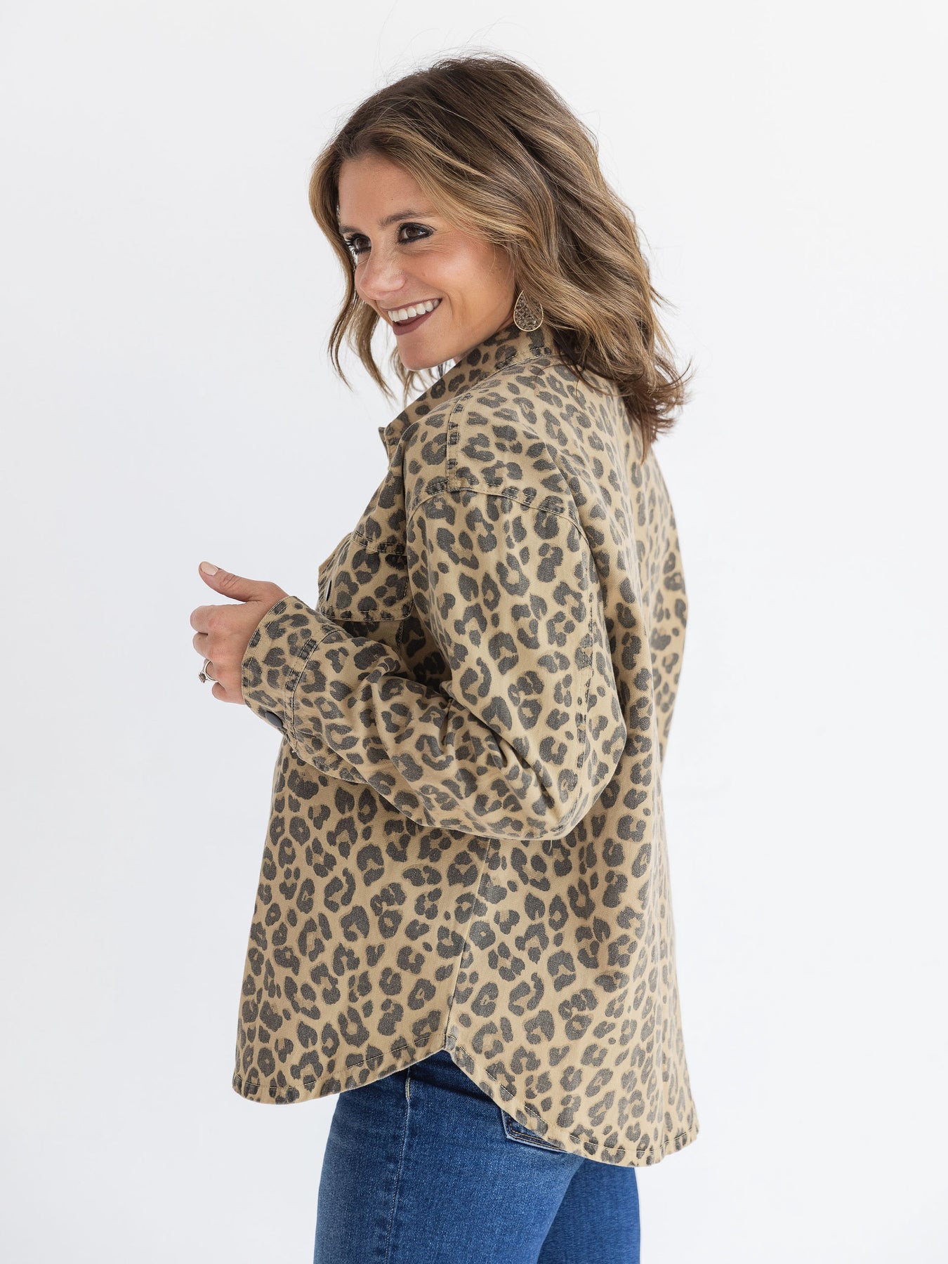 A button front jacket with collared neckline, pockets, and leopard print fabric. Model is shown in size small.