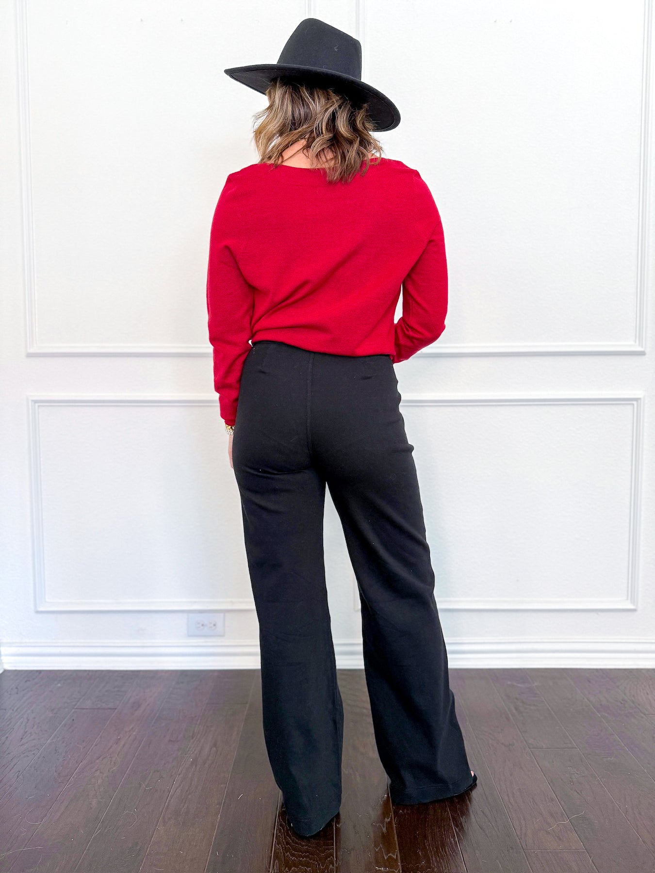 A cotton stretch twill pant with wide leg cut. Model is shown in size small.
