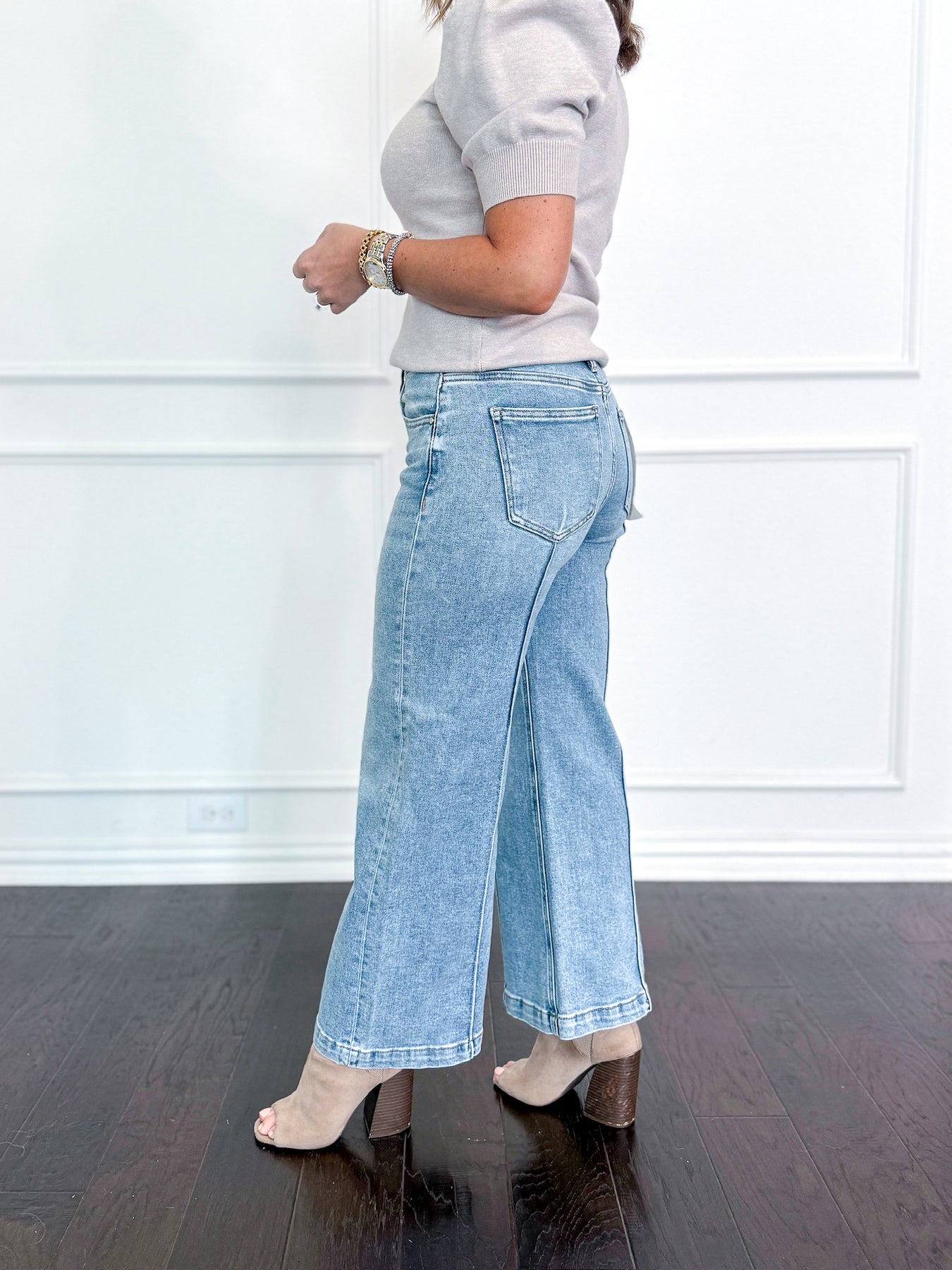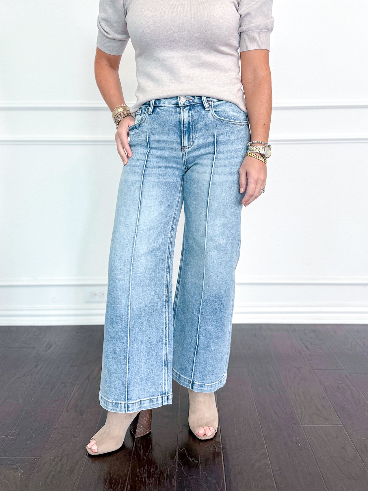 A wide leg denim jean with trouser cut and pintuck detail. Model is shown in size 1.