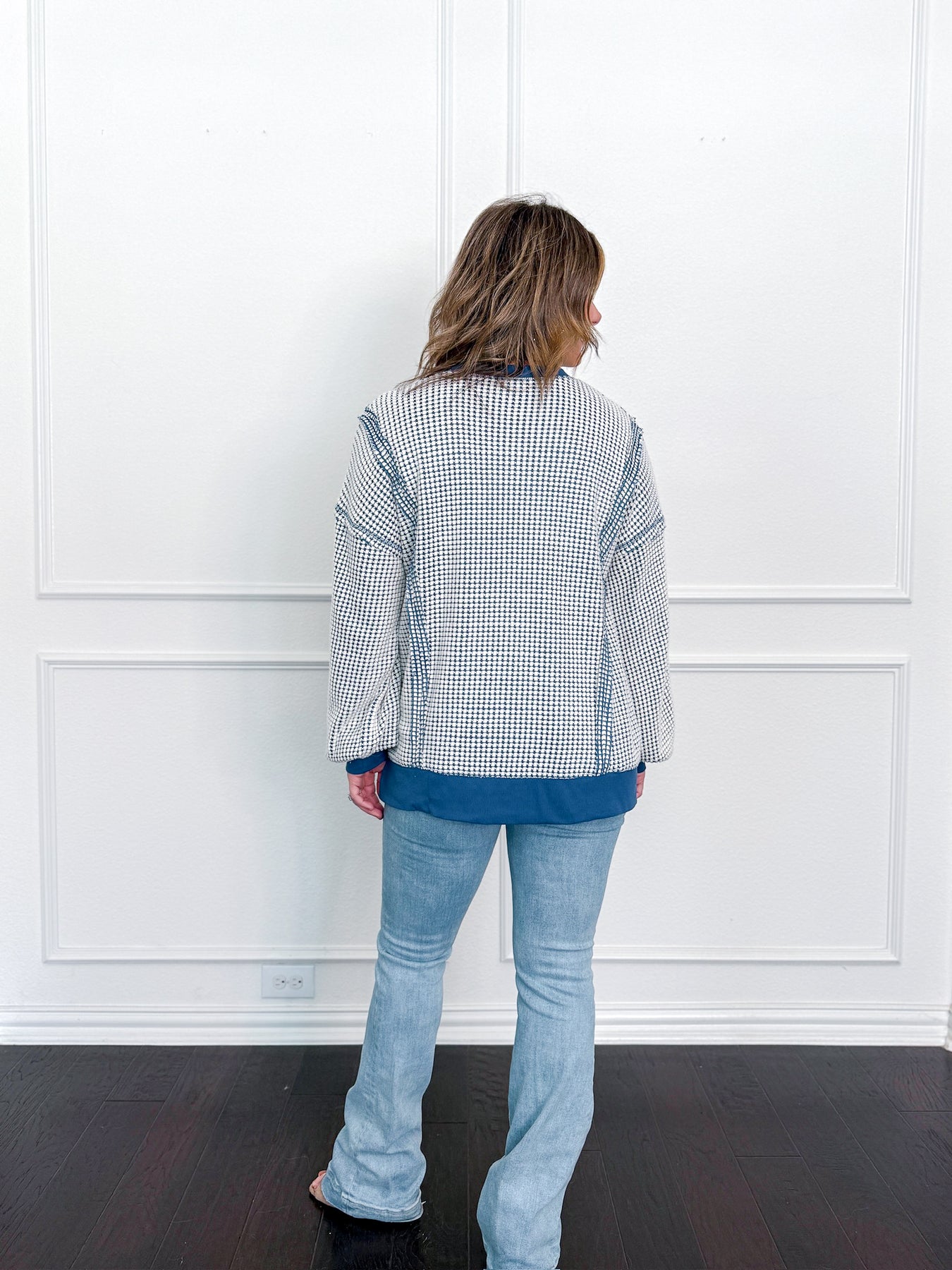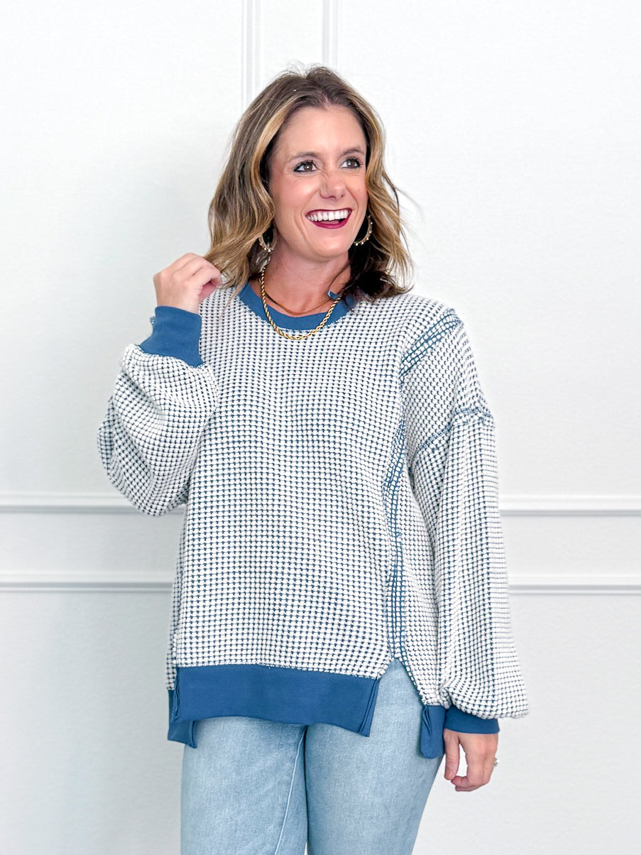 A crewneck sweatshirt with navy contrast at neckline, wrists, and waist. Exposed hem. Model is shown in size small.