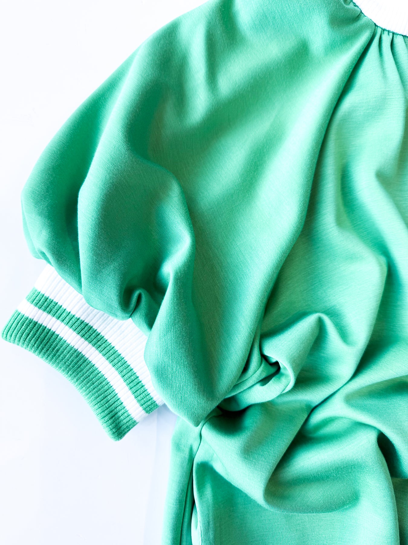 A beautiful puff sleeve dress - perfect for spring & summer! 1/2 zip front, collared neckline, puff sleeves, and athletic contrast at neckline & sleeves. Model is shown in size small.