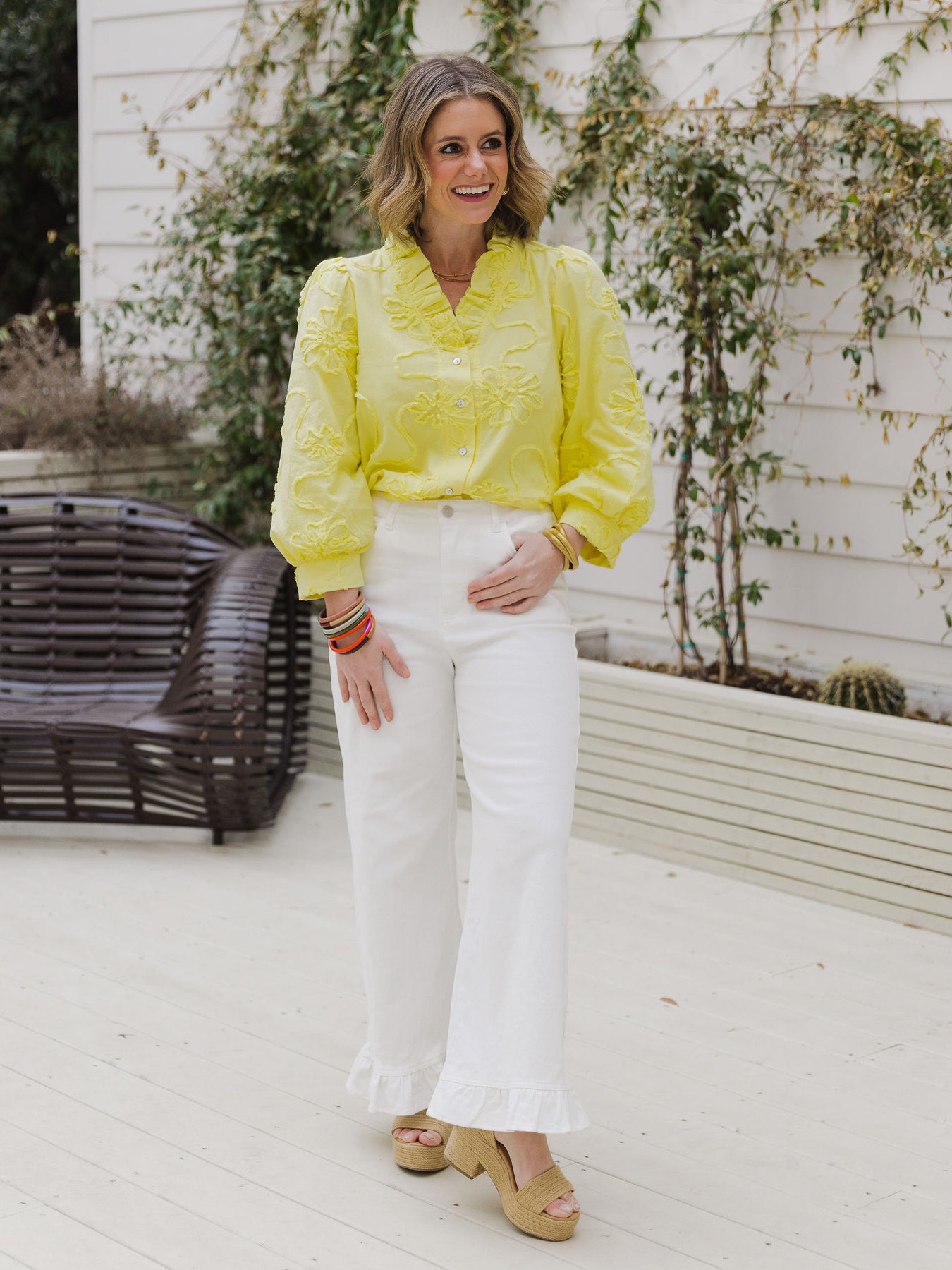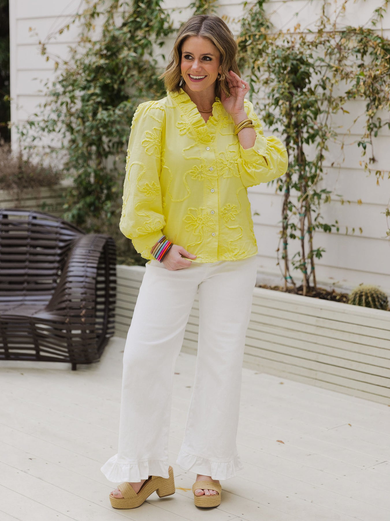 The cheerful yellow hue paired with delicate textured floral detailing makes this piece feel fresh, feminine, and effortlessly styled. Statement sleeves add just the right amount of drama, while the button-front design keeps it wearable and polished.