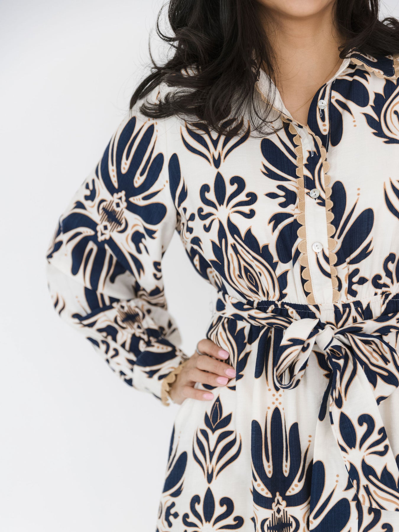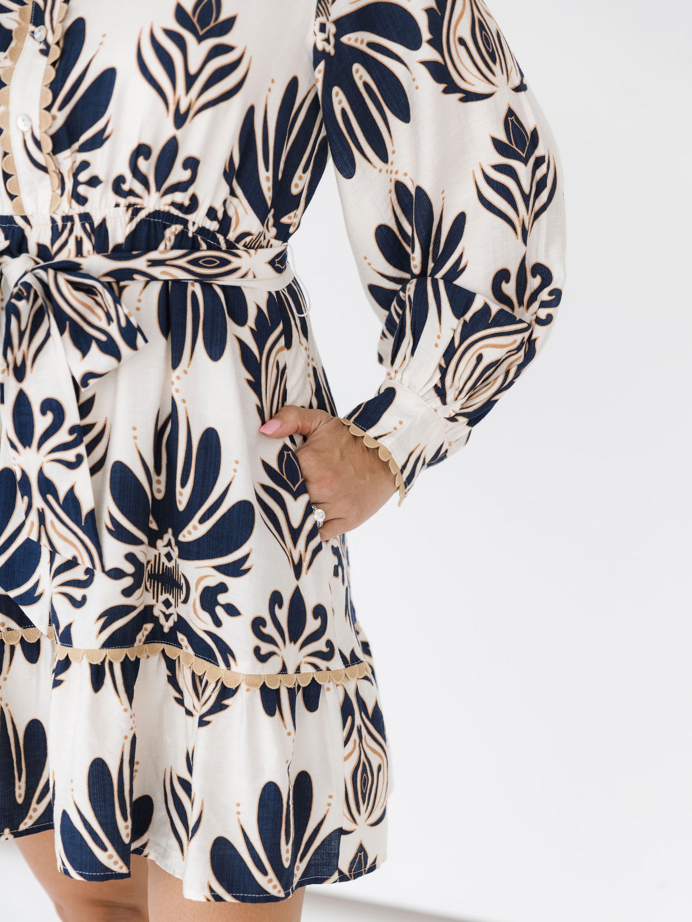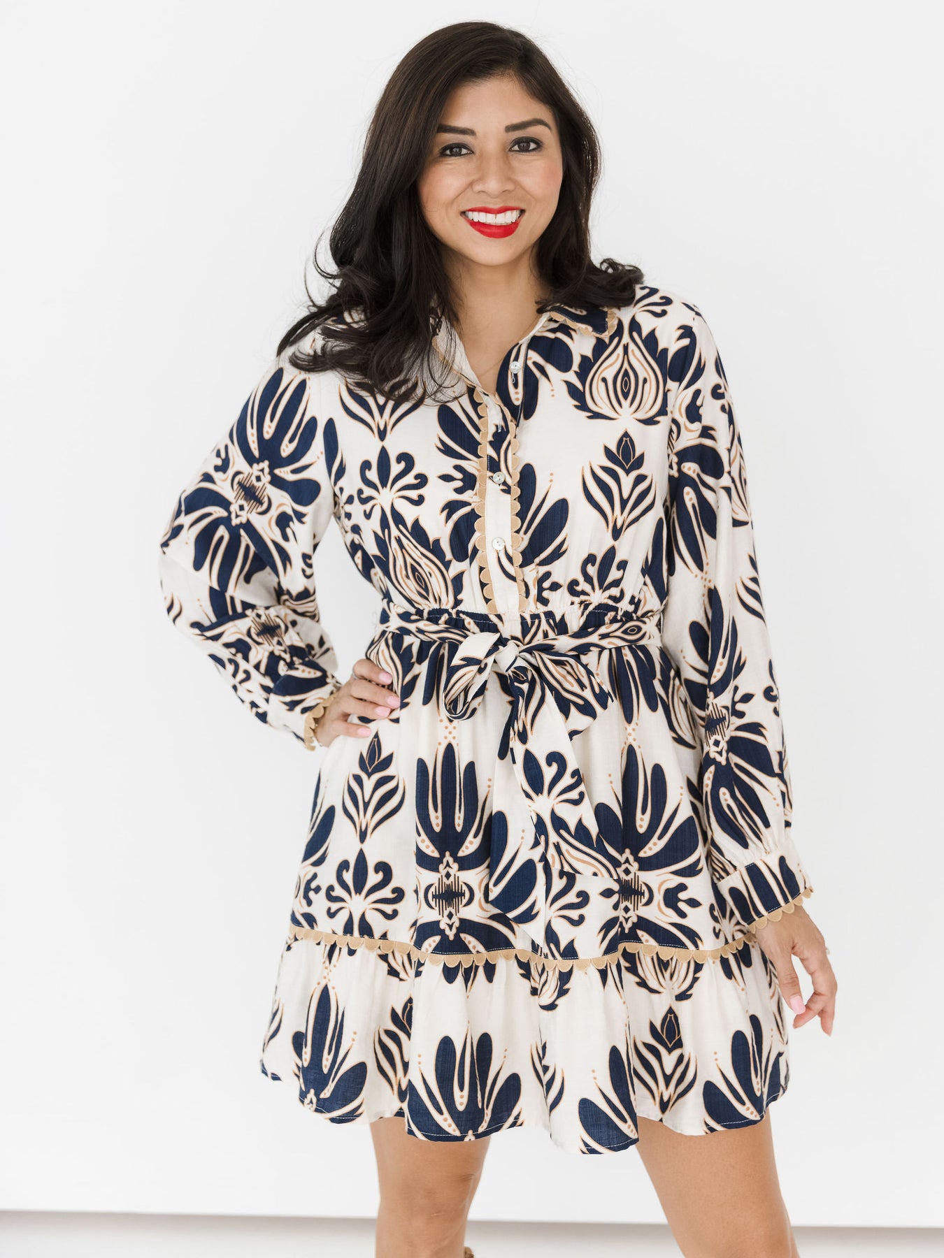 A beautiful long sleeved collared dress with cream base, navy pattern, & neutral details. Functional tie waist. Model is shown in size medium.