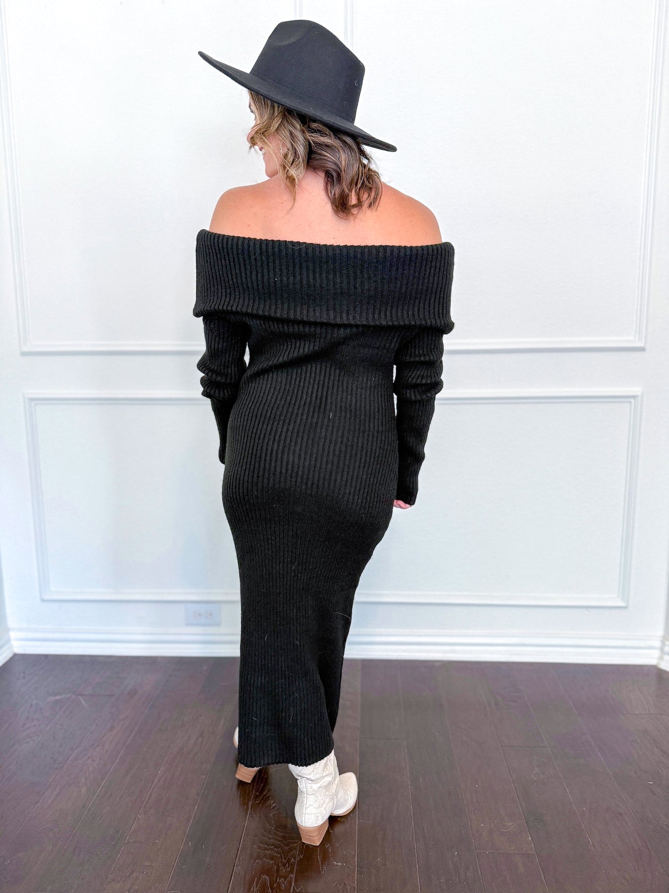 A ribbed long sleeved sweater dress with fold over cowl neckline. Model is shown in size small.