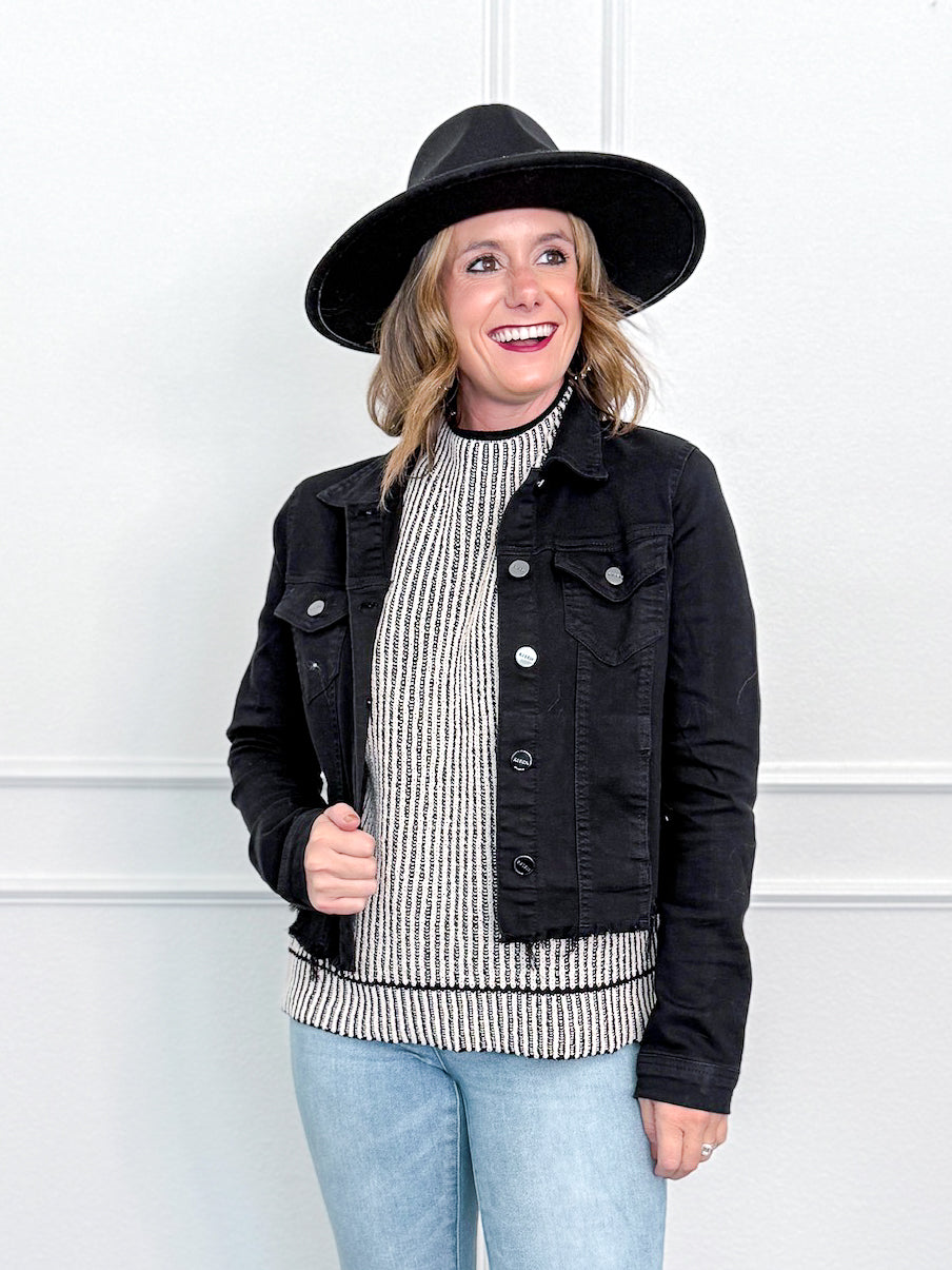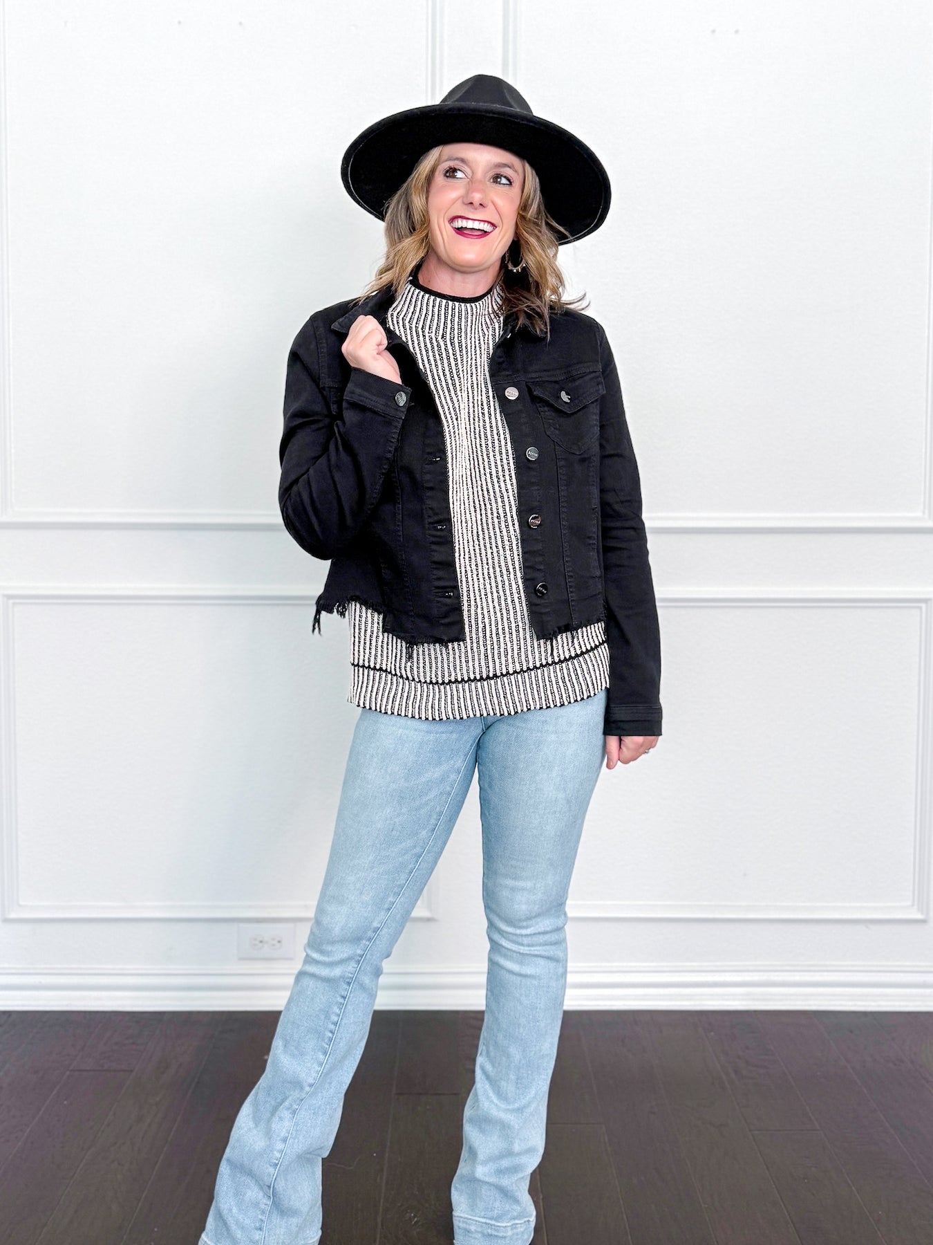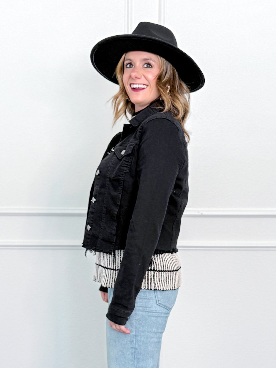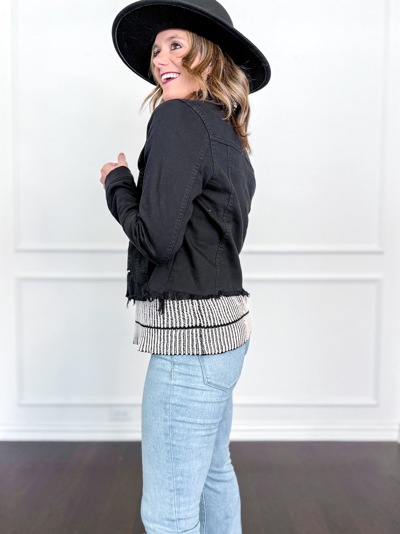 A statement black denim jacket with fun hemline. Model is shown in size small.