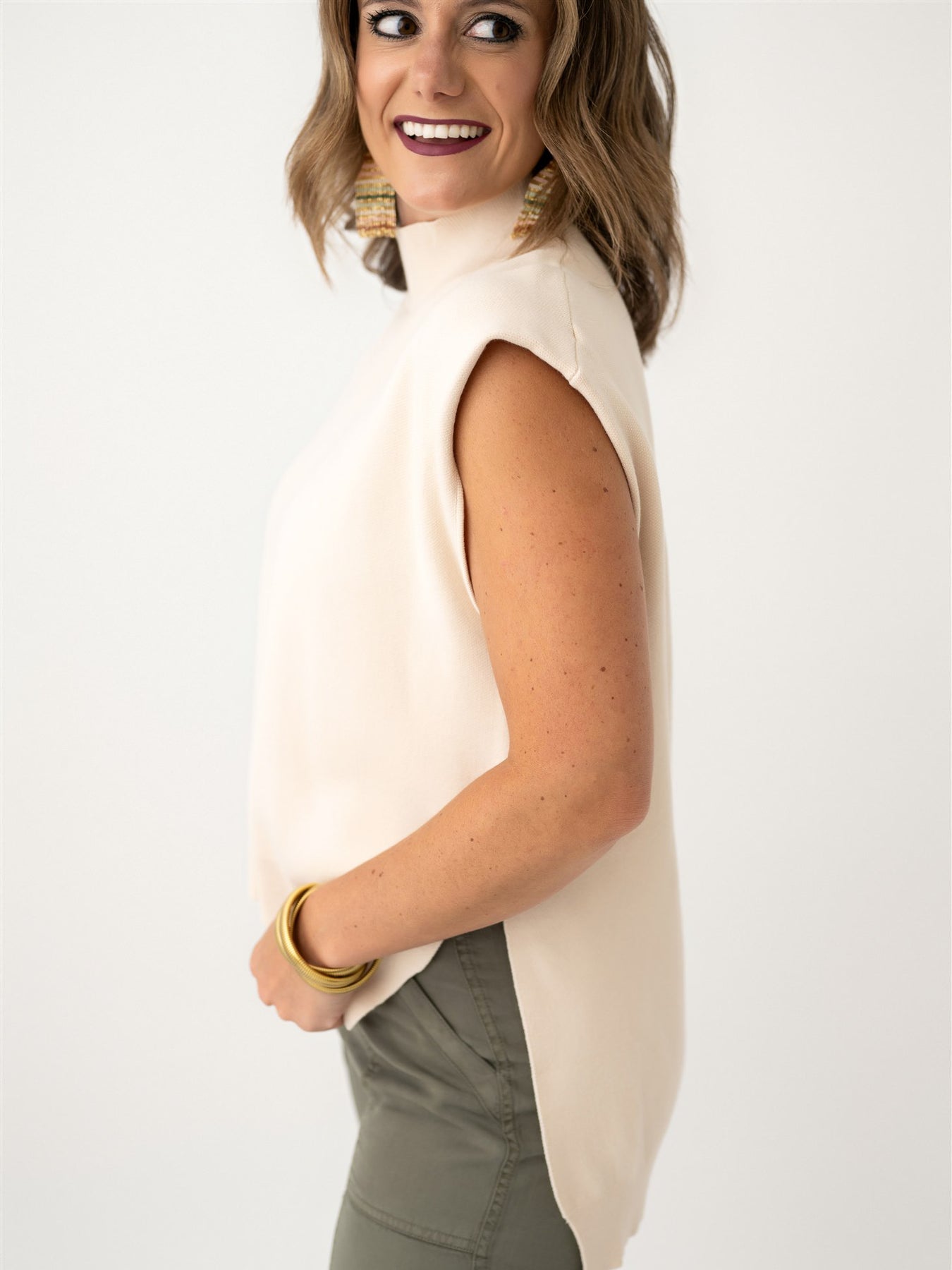 A sleeveless knit top with super soft feel & mock neckline. Model is shown in size small.