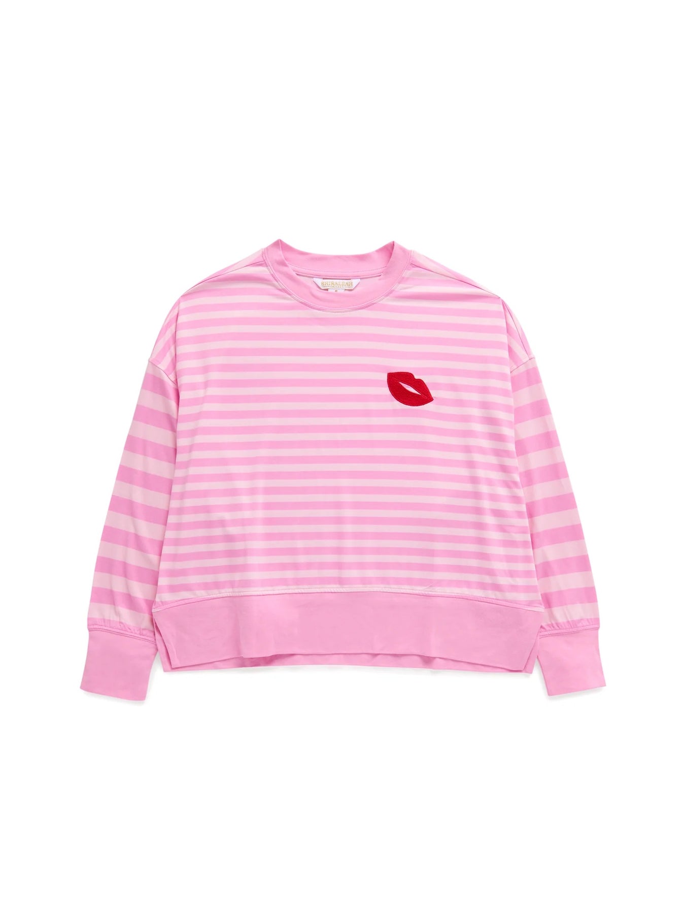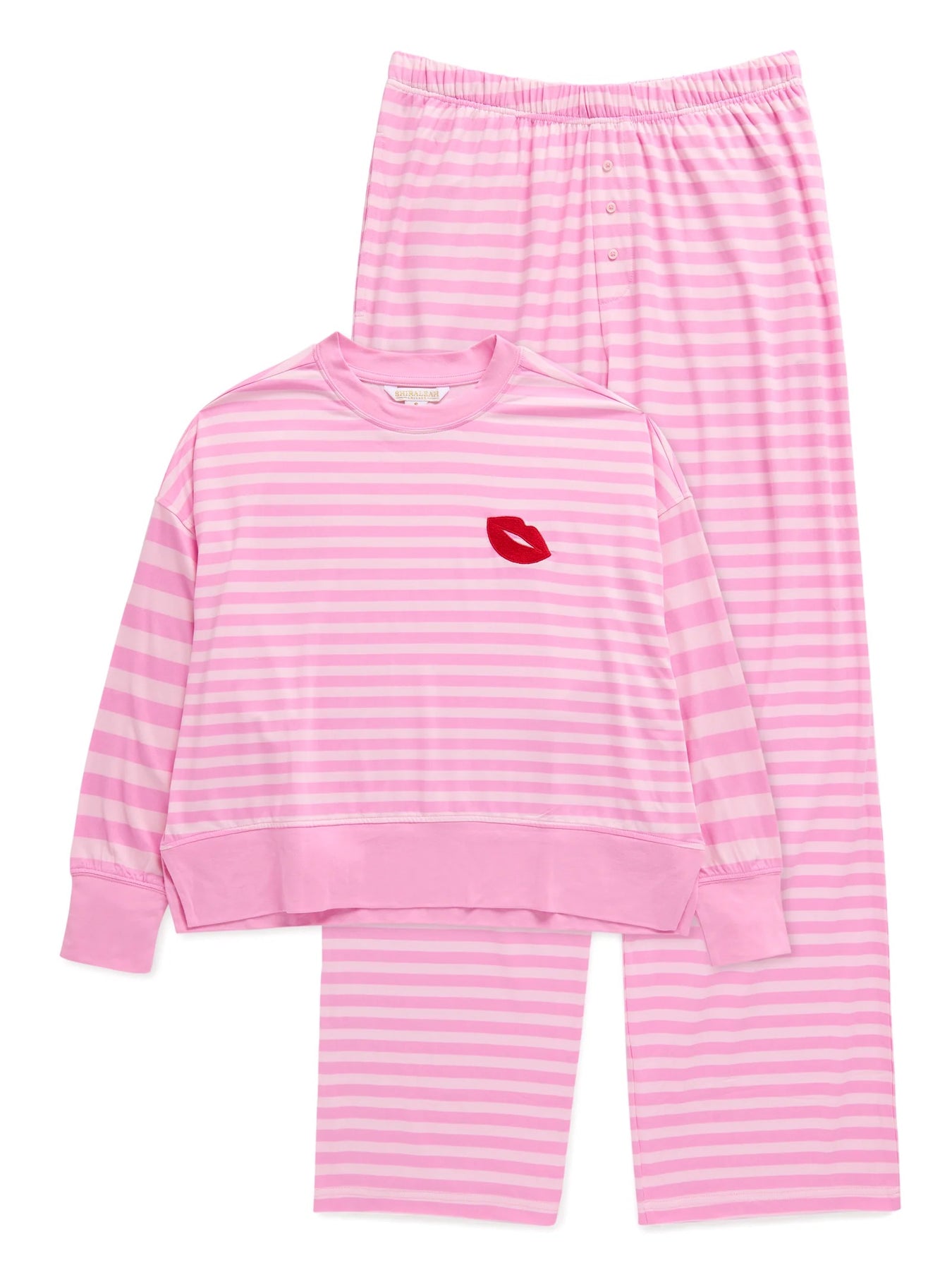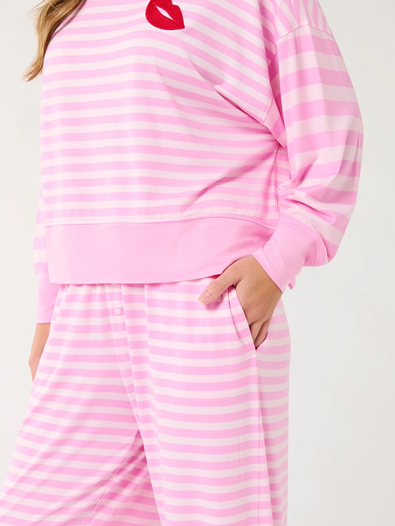 Say hello to sweet dreams in our Stripe Ultra-Soft Jersey Knit PJ Set, made for lounging in total comfort and style. The relaxed fit top pairs perfectly with matching striped pants featuring a 29" inseam and convenient on-seam pockets. Crafted from a buttery-soft jersey knit, this set feels as good as it looks. With a flirty red lip accent on the chest and soft pink stripes throughout, it's your new favorite excuse to stay in.