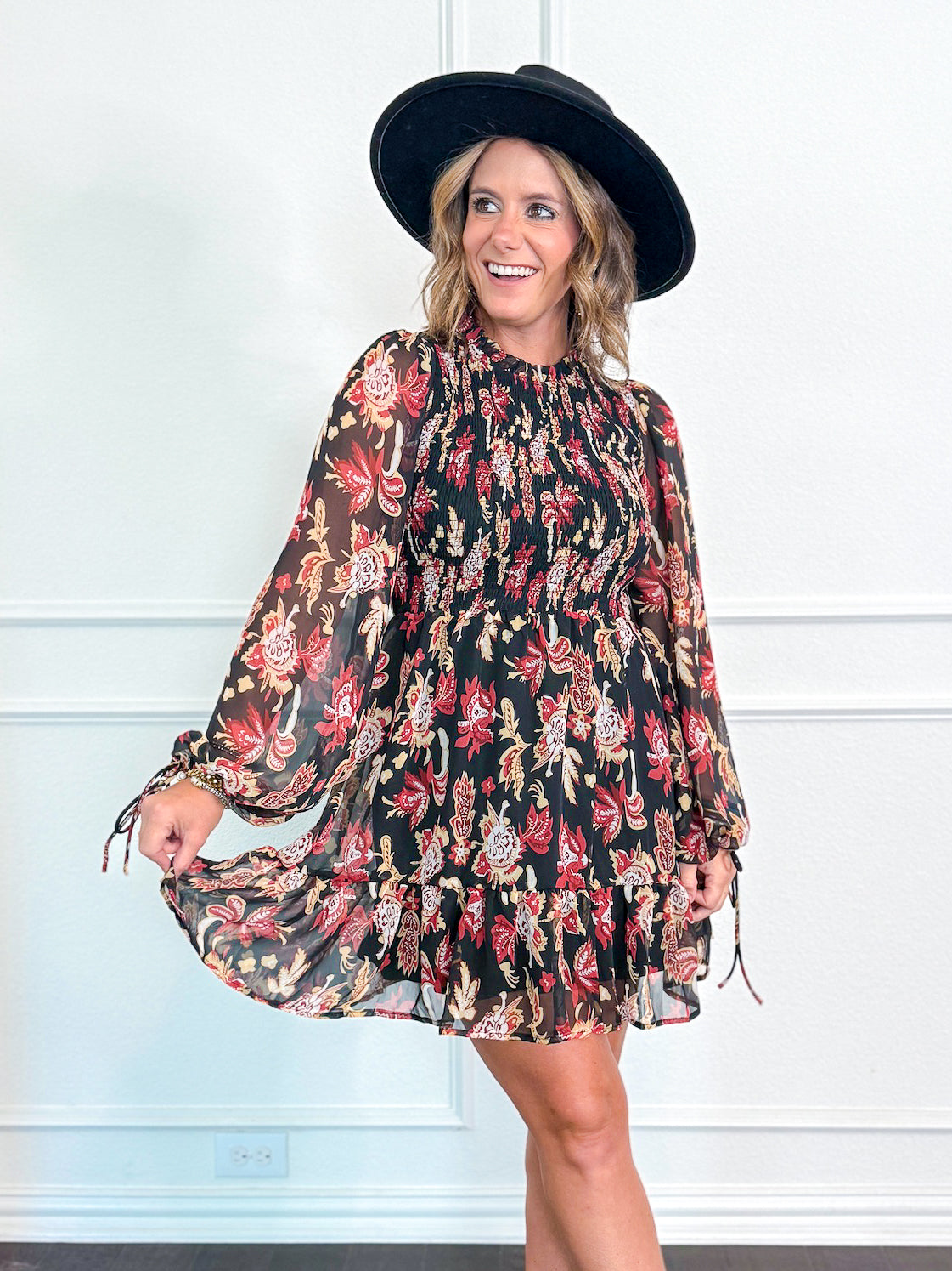 A long sleeved dress with high ruffled neckline and smocked bodice. Black base, floral pattern. Model is shown in size small.